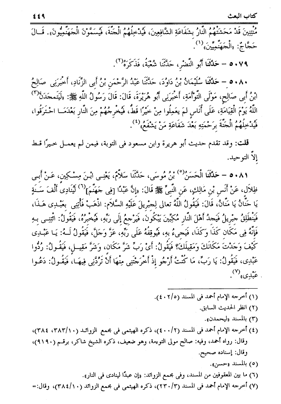 5080 - حَدَّثَنَا سُلَيْمَانُ بْنُ دَاوُدَ، حَدَّثَنَا عَبْدُ الرَّحْمَنِ بْنُ أَبِى الزِّنَادِ، أَخْبَرَنِى صَالِحُ ابْنُ أَبِى صَالِحٍ، مَوْلَى التَّوْأَمَةِ، أَخْبَرَنِى أَبُو هُرَيْرَةَ، قَالَ: قَالَ رَسُولُ اللَّهِ صلى الله عليه وسلم: لَيَتَمجَدَنَّ اللَّهُ يَوْمَ الْقِيَامَةِ، عَلَى أُنَاسٍ لمَ يعَمِلُوا مِنْ خَيْرًا قَطُّ، فَيُخْرِجُهُمْ مِنَ النَّارِ بَعْدَمَا احْتَرَقُوا، فَيُدْخِلُهُمُ الْجَنَّةَ بِرَحْمَتِهِ بَعْدَ شَفَاعَةِ مَنْ يَشْفَعُ.