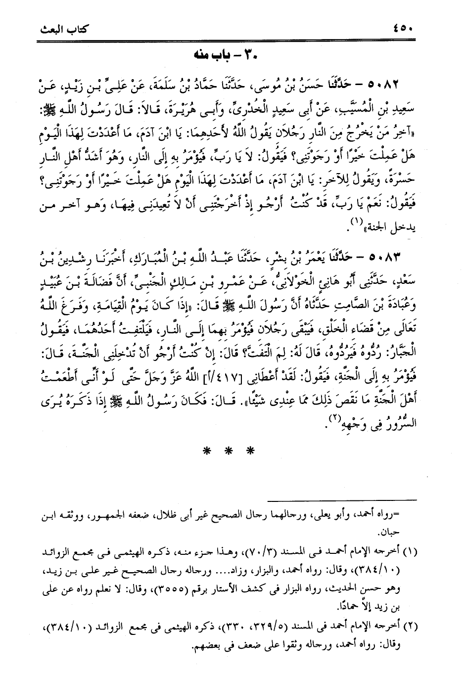 5082 - حَدَّثَنَا حَسَنُ بْنُ مُوسَى، حَدَّثَنَا حَمَّادُ بْنُ سَلَمَةَ، عَنْ عَلِىِّ بْنِ زَيْدٍ، عَنْ سَعِيدِ بْنِ الْمُسَيَّبِ، عَنْ أَبِى سَعِيدٍ الْخُدْرِىِّ، وَأَبِى هُرَيْرَةَ، قَالاَ: قَالَ رَسُولُ اللَّهِ صلى الله عليه وسلم: آخِرُ مَنْ يَخْرُجُ مِنَ النَّارِ رَجُلاَنِ يَقُولُ اللَّهُ لأَحَدِهِمَا: يَا ابْنَ آدَمَ، مَا أَعْدَدْتَ لِهَذَا الْيَوْمِ هَلْ عَمِلْتَ خَيْرًا أَوْ رَجَوْتَنِى؟ فَيَقُولُ: لاَ يَا رَبِّ، فَيُؤْمَرُ بِهِ إِلَى النَّارِ، وَهُوَ أَشَدُّ أَهْلِ النَّارِ حَسْرَةً، وَيَقُولُ لِلآخَرِ: يَا ابْنَ آدَمَ، مَا أَعْدَدْتَ لِهَذَا الْيَوْمِ هَلْ عَمِلْتَ خَيْرًا أَوْ رَجَوْتَنِى؟ فَيَقُولُ: نَعَمْ يَا رَبِّ، قَدْ كُنْتُ أَرْجُو إِذْ أَخْرَجْتَنِى أَنْ لاَ تُعِيدَنِى فِيهَا، وَهو آخر من يدخل الجنة.