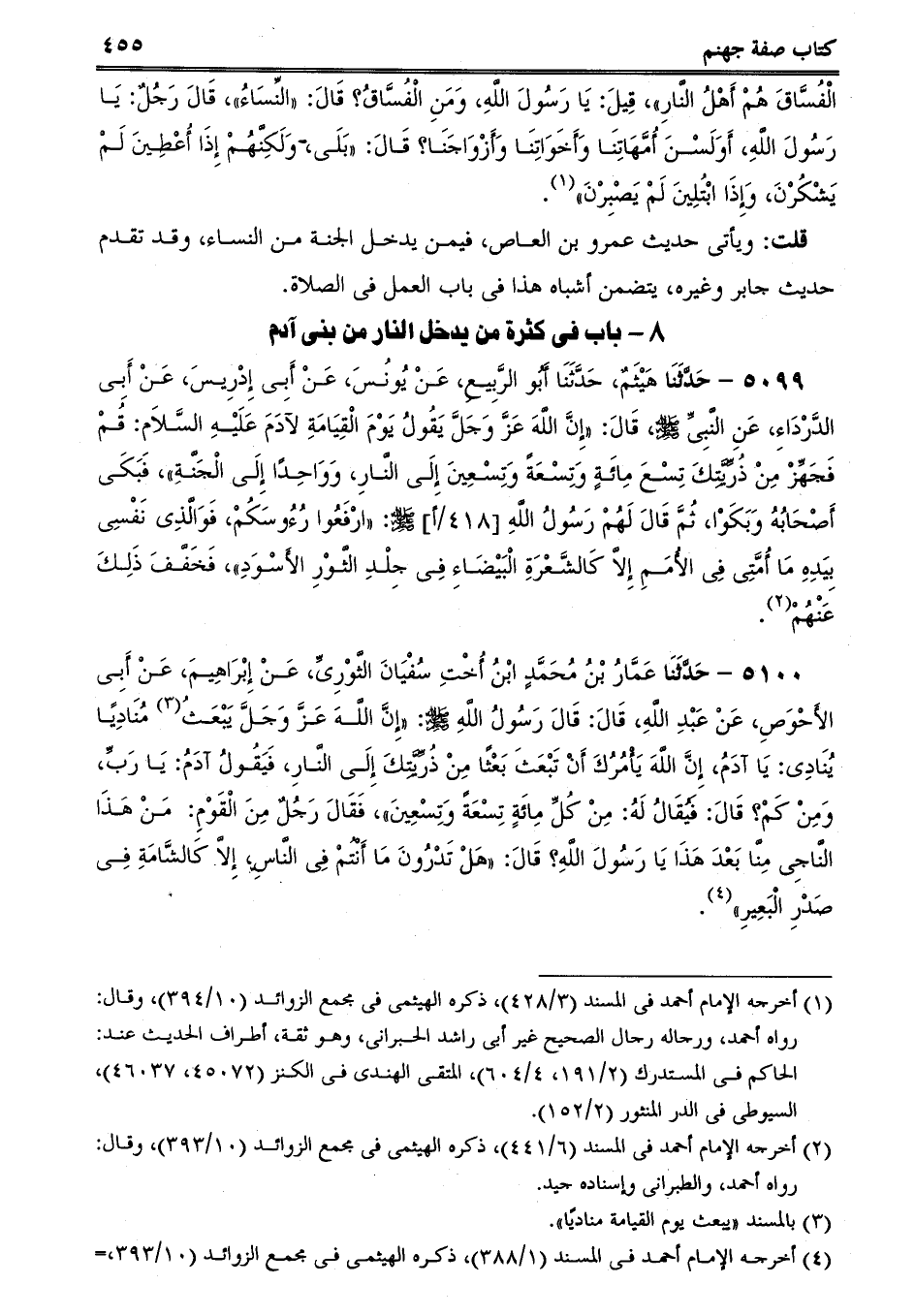 5100 - حَدَّثَنَا عَمَّارُ بْنُ مُحَمَّدٍ ابْنُ أُخْتِ سُفْيَانَ الثَّوْرِىِّ، عَنْ إِبْرَاهِيمَ، عَنْ أَبِى الأَحْوَصِ، عَنْ عَبْدِ اللَّهِ، قَالَ: قَالَ رَسُولُ اللَّهِ صلى الله عليه وسلم: إِنَّ اللَّهَ عَزَّ وَجَلَّ يَبْعَثُ مُنَادِيًا يُنَادِى: يَا آدَمُ، إِنَّ اللَّهَ يَأْمُرُكَ أَنْ تَبْعَثَ بَعْثًا مِنْ ذُرِّيَّتِكَ إِلَى النَّارِ، فَيَقُولُ آدَمُ: يَا رَبِّ، وَمِنْ كَمْ؟ قَالَ: فَيُقَالُ لَهُ: مِنْ كُلِّ مِائَةٍ تِسْعَةً وَتِسْعِينَ، فَقَالَ رَجُلٌ مِنَ الْقَوْمِ: مَنْ هَذَا النَّاجِى مِنَّا بَعْدَ هَذَا يَا رَسُولَ اللَّهِ؟ قَالَ: هَلْ تَدْرُونَ مَا أَنْتُمْ فِى النَّاسِ، إِلاَّ كَالشَّامَةِ فِى صَدْرِ الْبَعِيرِ.