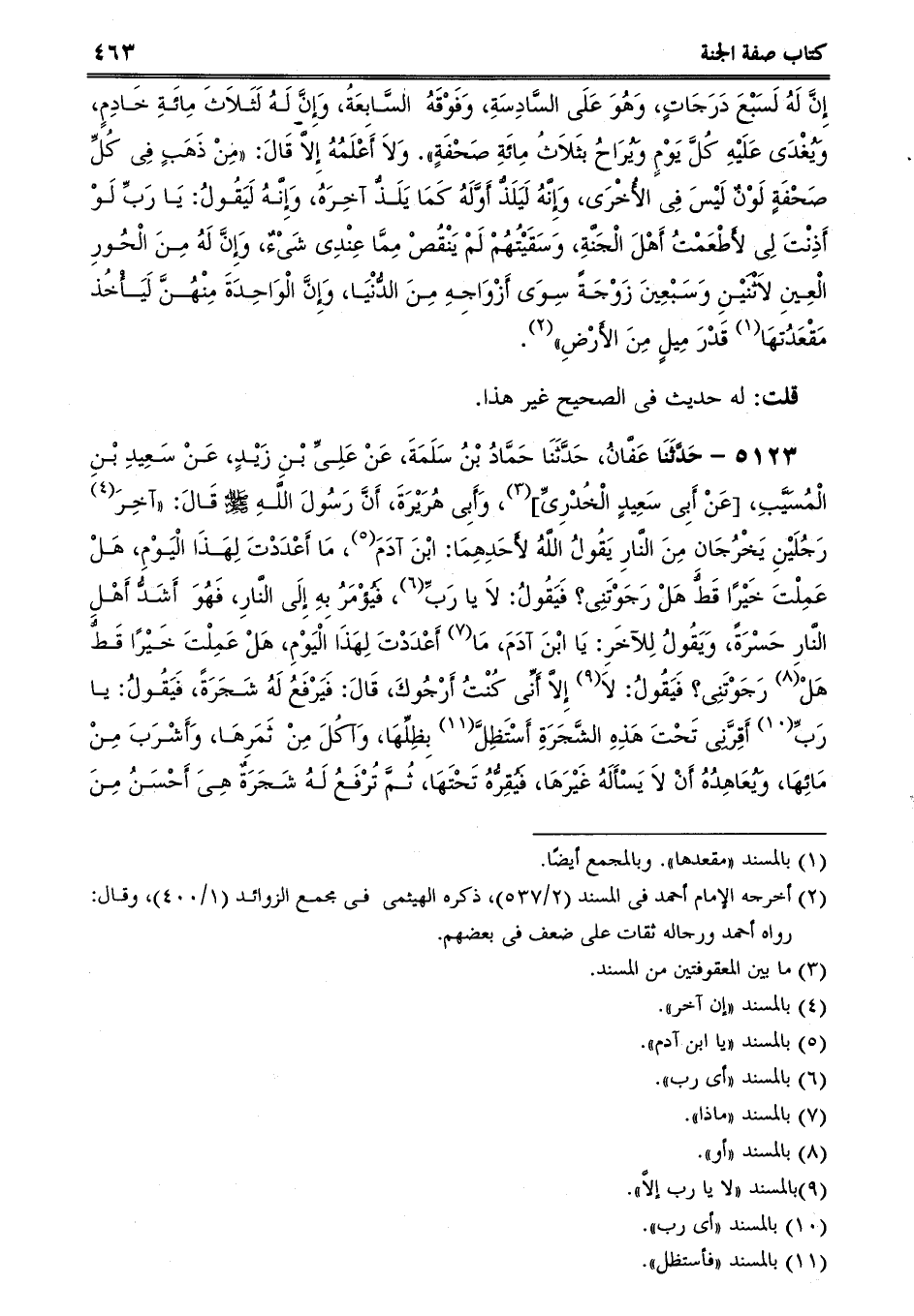 5123 - حَدَّثَنَا عَفَّانُ، حَدَّثَنَا حَمَّادُ بْنُ سَلَمَةَ، عَنْ عَلِىِّ بْنِ زَيْدٍ، عَنْ سَعِيدِ بْنِ الْمُسَيَّبِ، [عَنْ أَبِى سَعِيدٍ الْخُدْرِىِّ] ، وَأَبِى هُرَيْرَةَ، أَنَّ رَسُولَ اللَّهِ صلى الله عليه وسلم قَالَ: آخِرَ رَجُلَيْنِ يَخْرُجَانِ مِنَ النَّارِ يَقُولُ اللَّهُ لأَحَدِهِمَا: ابْنَ آدَمَ، مَا أَعْدَدْتَ لِهَذَا الْيَوْمِ، هَلْ عَمِلْتَ خَيْرًا قَطُّ هَلْ رَجَوْتَنِى؟ فَيَقُولُ: لاَ يا رَبِّ، فَيُؤْمَرُ بِهِ إِلَى النَّارِ، فَهُوَ أَشَدُّ أَهْلِ النَّارِ حَسْرَةً، وَيَقُولُ لِلآخَرِ: يَا ابْنَ آدَمَ، مَا أَعْدَدْتَ لِهَذَا الْيَوْمِ، هَلْ عَمِلْتَ خَيْرًا قَطُّ هَلْ رَجَوْتَنِى؟ فَيَقُولُ: لاَ إِلاَّ أَنِّى كُنْتُ أَرْجُوكَ، قَالَ: فَيَرْفَعُ لَهُ شَجَرَةً، فَيَقُولُ: يا رَبِّ أَقِرَّنِى تَحْتَ هَذِهِ الشَّجَرَةِ أَسْتَظِلَّ بِظِلِّهَا، وَآكُلَ مِنْ ثَمَرِهَا، وَأَشْرَبَ مِنْ مَائِهَا، وَيُعَاهِدُهُ أَنْ لاَ يَسْأَلَهُ غَيْرَهَا، فَيُقِرُّهُ تَحْتَهَا، ثُمَّ تُرْفَعُ لَهُ شَجَرَةٌ هِىَ أَحْسَنُ مِنَ -[464]- الأُولَى، وَأَغْدَقُ مَاءً، فَيَقُولُ: يا رَبِّ أَقِرَّنِى تَحْتَهَا لاَ أَسْأَلُكَ غَيْرَهَا، فَأَسْتَظِلَّ بِظِلِّهَا وَأَشْرَبَ مِنْ مَائِهَا، فَيَقُولُ: يَا ابْنَ آدَمَ، أَلَمْ تُعَاهِدْنِى أَنْ لاَ تَسْأَلَنِى غَيْرَهَا؟ [....] فَيُقِرُّهُ تَحْتَهَا، ثُمَّ تُرْفَعُ لَهُ شَجَرَةٌ عِنْدَ بَابِ الْجَنَّةِ هِىَ أَحْسَنُ مِنَ الأَوَّلَتَيْنِ، وَأَغْدَقُ مَاءً، فَيَقُولُ: يا رَبِّ أَقِرَّنِى تَحْتَهَا، فَيُدْنِيَهُ مِنْهَا، وَيُعَاهِدُهُ أَنْ لاَ يَسْأَلَهُ غَيْرَهَا فَيَسْمَعُ أَصْوَاتَ أَهْلِ الْجَنَّةِ، فَلاَ يَتَمَالَكْ، فَيَقُولُ: أَىْ رَبِّ، الْجَنَّةَ، أَىْ رَبِّ أَدْخِلْنِى الْجَنَّةَ، فَيَقُولُ اللَّهُ عَزَّ وَجَلَّ: سَلْ وَتَمَنَّهْ فَيَسْأَلَ، وَيَتَمَنَّى بِمِقْدَارِ ثَلاَثَةِ أَيَّامٍ مِنْ أَيَّامِ الدُّنْيَا، وَيُلَقِّنُهُ اللَّهُ مَا لاَ عِلْمَ لَهُ بِهِ، فَيَسْأَلُ وَيَتَمَنَّى، فَإِذَا فَرَغَ، قَالَ: لَكَ مَا سَأَلْتَ، قَالَ أَبُو سَعِيدٍ: وَمِثْلُهُ مَعَهُ، وَقَالَ أَبُو هُرَيْرَةَ: وَعَشَرَةُ أَمْثَالِهِ مَعَهُ، قَالَ أَحَدُهُمَا لِصَاحِبِهِ: حَدِّثْ بِمَا سَمِعْتَ، وَأُحَدِّثُ بِمَا سَمِعْتُ.