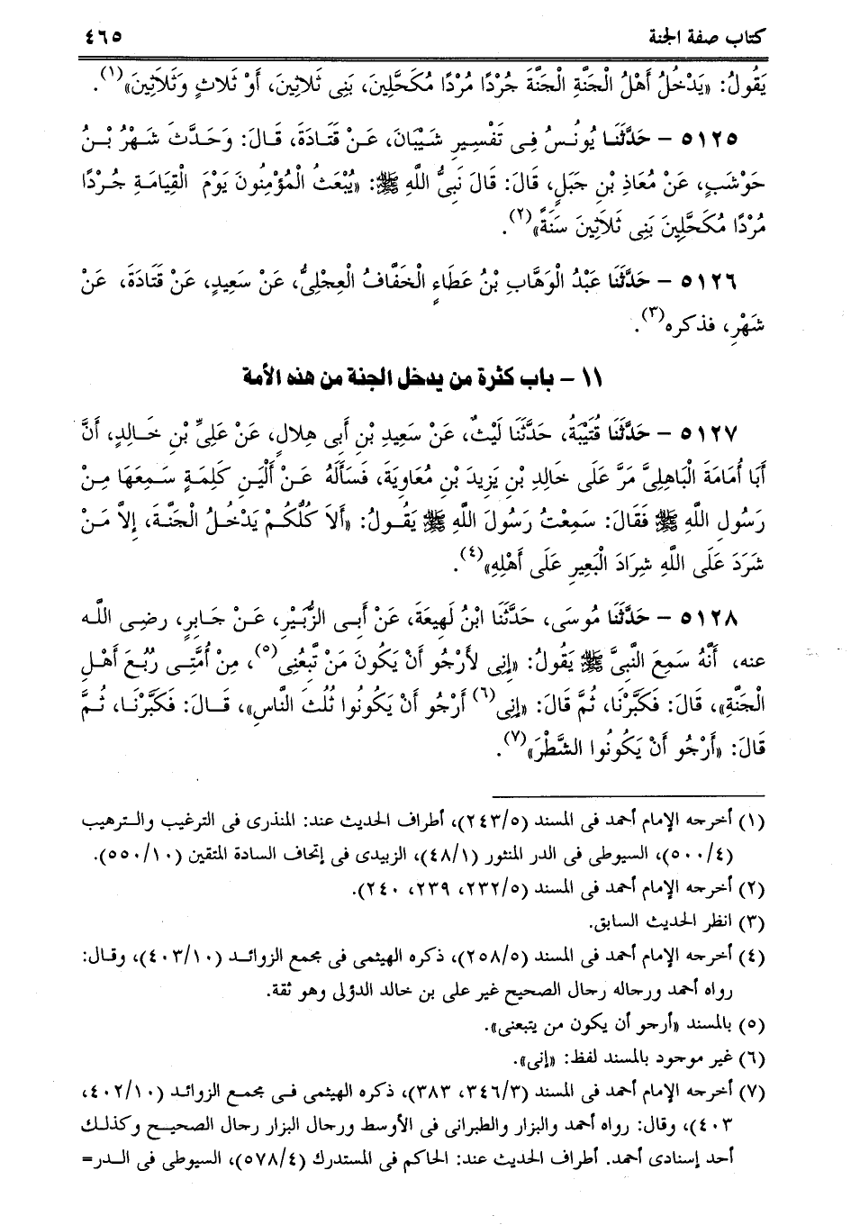 5128 - حَدَّثَنَا مُوسَى، حَدَّثَنَا ابْنُ لَهِيعَةَ، عَنْ أَبِى الزُّبَيْرِ، عَنْ جَابِرٍ، رضِى اللَّه عنه، أَنَّهُ سَمِعَ النَّبِىَّ صلى الله عليه وسلم يَقُولُ: إِنِى لأَرْجُو أَنْ يَكُونَ مَنْ تَّبِعُنِى، مِنْ أُمَّتِى رُبُعَ أَهْلِ الْجَنَّةِ، قَالَ: فَكَبَّرْنَا، ثُمَّ قَالَ: إنِى أَرْجُو أَنْ يَكُونُوا ثُلُثَ النَّاسِ، قَالَ: فَكَبَّرْنَا، ثُمَّ قَالَ: أَرْجُو أَنْ يَكُونُوا الشَّطْرَ.