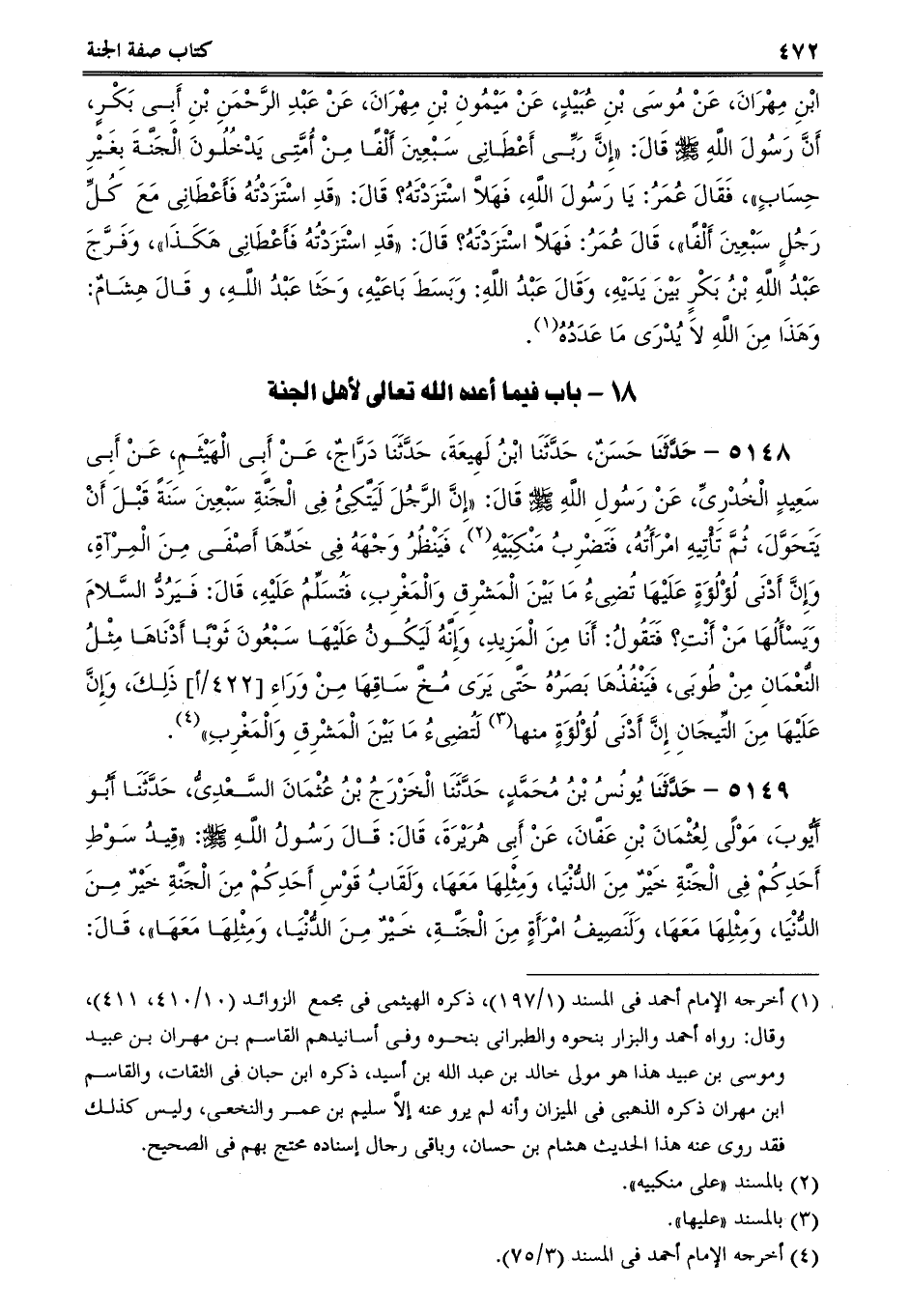 5148 - حَدَّثَنَا حَسَنٌ، حَدَّثَنَا ابْنُ لَهِيعَةَ، حَدَّثَنَا دَرَّاجٌ، عَنْ أَبِى الْهَيْثَمِ، عَنْ أَبِى سَعِيدٍ الْخُدْرِىِّ، عَنْ رَسُولِ اللَّهِ صلى الله عليه وسلم قَالَ: إِنَّ الرَّجُلَ لَيَتَّكِئُ فِى الْجَنَّةِ سَبْعِينَ سَنَةً قَبْلَ أَنْ يَتَحَوَّلَ، ثُمَّ تَأْتِيهِ امْرَأَتُهُ، فَتَضْرِبُ مَنْكِبَيْهِ، فَيَنْظُرُ وَجْهَهُ فِى خَدِّهَا أَصْفَى مِنَ الْمِرْآةِ، وَإِنَّ أَدْنَى لُؤْلُؤَةٍ عَلَيْهَا تُضِىءُ مَا بَيْنَ الْمَشْرِقِ وَالْمَغْرِبِ، فَتُسَلِّمُ عَلَيْهِ، قَالَ: فَيَرُدُّ السَّلامَ وَيَسْأَلُهَا مَنْ أَنْتِ؟ فَتَقُولُ: أَنَا مِنَ الْمَزِيدِ، وَإِنَّهُ لَيَكُونُ عَلَيْهَا سَبْعُونَ ثَوْبًا أَدْنَاهَا مِثْلُ النُّعْمَانِ مِنْ طُوبَى، فَيَنْفُذُهَا بَصَرُهُ حَتَّى يَرَى مُخَّ سَاقِهَا مِنْ وَرَاءِ ذَلِكَ، وَإِنَّ عَلَيْهَا مِنَ التِّيجَانِ إِنَّ أَدْنَى لُؤْلُؤَةٍ منها لَتُضِىءُ مَا بَيْنَ الْمَشْرِقِ وَالْمَغْرِبِ.