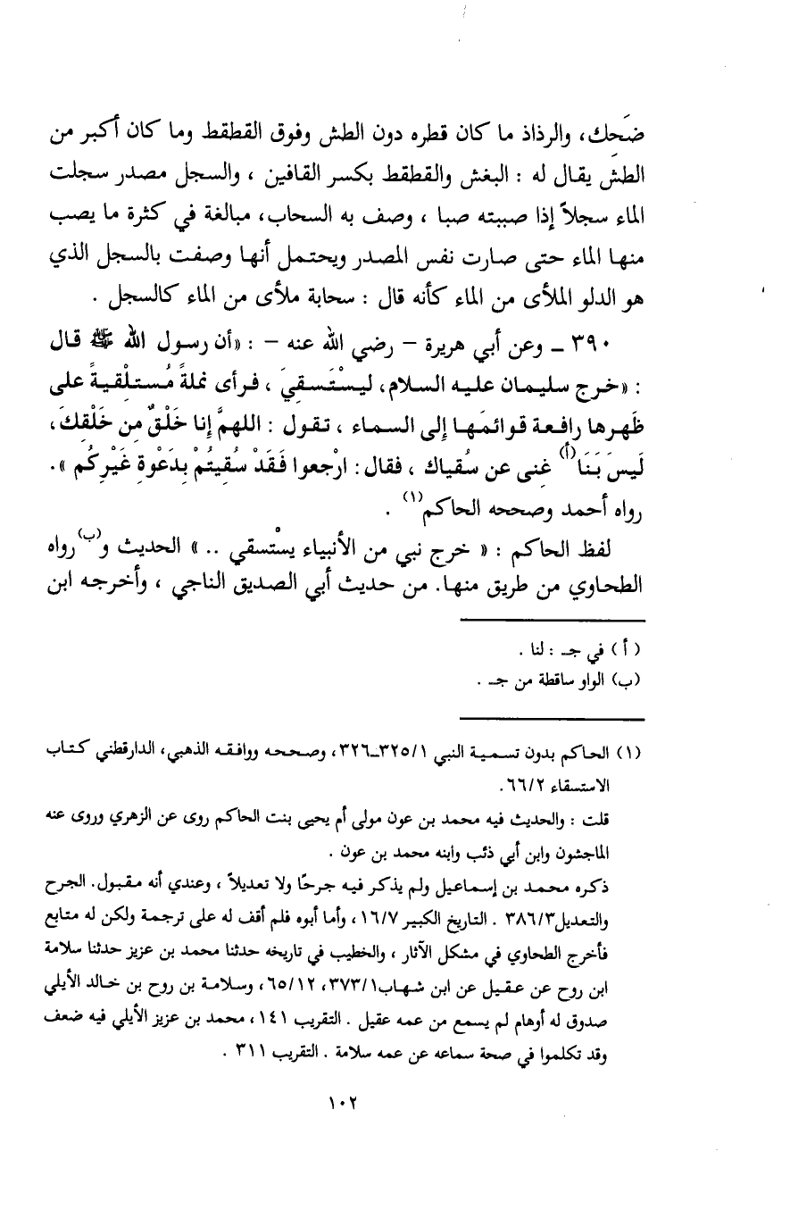 لفظ الحاكم: "خرج نبي من الأنبياء يسْتسقي .. " الحديث و (ب) رواه الطحاوي من طريق منها من حديث أَبي الصديق الناجي، وأخرجه ابن