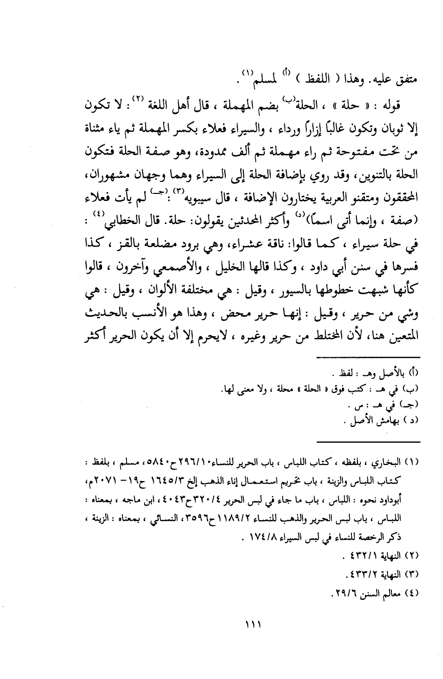 قوله: "حلة"، الحلة (ب) بضم المهملة، قال أهل اللغة (¬2): لا تكون إلا ثوبان وتكون غالبًا إزارًا ورداء، والسيراء فعلاء بكسر المهملة ثم ياء مثناة من تحت مفتوحة ثم راء مهملة ثم ألف ممدودة، وهو صفة الحلة فتكون الحلة بالتنوين، وقد روي بإضافة الحلة إلى السيراء وهما وجهان مشهوران، المحققون ومتقنو العربية يختارون الإضافة، قال سيبويه (¬3): (ب) لم يأت فعلاء (صفة، وإنما أتى اسمًا) (د) وأكثر المحدثين يقولون: حلة. قال الخطابي (¬4): في حلة سيراء، كما قالوا: ناقة عشراء، وهي برود مضلعة بالقز، كذا فسرها في سنن أَبي داود، وكذا قالها الخليل، والأصمعي وآخرون، قالوا كأنها شبهت خطوطها بالسيور، وقيل: في مختلفة الألوان، وقيل: هي وشي من حرير، وقيل: إنها حرير محض، وهذا هو الأنسب بالحديث المتعين هنا، لأن المختلط من حرير وغيره، لا يحرم إلا أن يكون الحرير أكثر