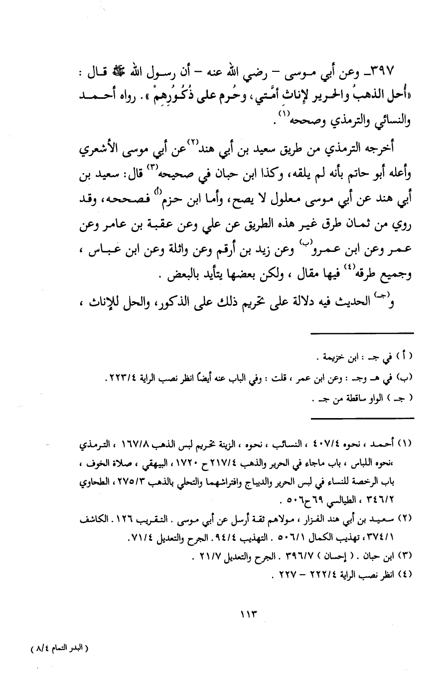 397 - وعن أبي موسى - رضي الله عنه - أن رسول الله - صلى الله عليه وسلم - قال: "أُحل الذهبُ والحرير لإِناث أمَّتي، وحُرم على ذُكوُرِهِمْ". رواه أحمد والنسائي والترمذي وصححه (¬1).