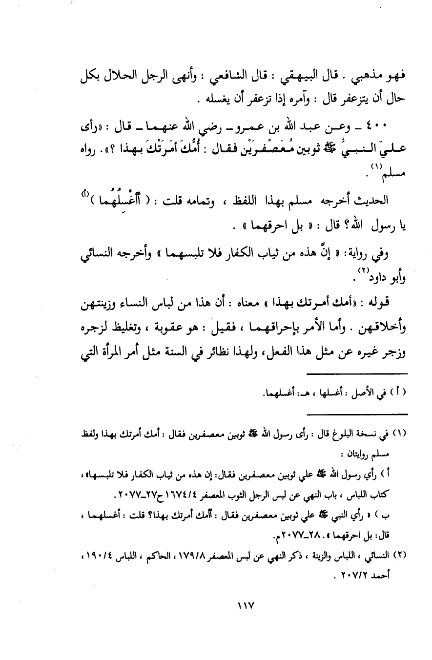 ب) "رأى النبي - صلى الله عليه وسلم - علي ثوبين معصفرين فقال: أأمك أمرتك بهذا؟ قلت: أغسلهما، قال: بل احرقهما". 28 - 2077 م.