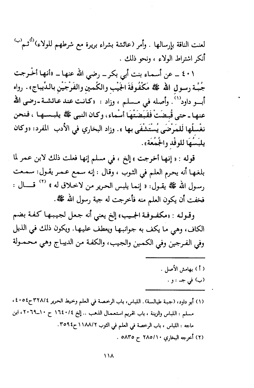 401 - عن أسماء بنت أبي بكر - رضي الله عنها - "أنها أخْرجت جُبَّة رسولِ الله - صلى الله عليه وسلم - مَكفُوفَةَ الجَيْبِ والكُمينِ والفَرْجَيْنِ بالدِّيباج". رواه أبو داود (¬1). وأصله في مسلم، وزاد: "كانت عند عائشة رضي الله عنها حتى قُبِضَتْ فَقَبَضَتْهَا أسْماء، وكان النبي - صلى الله عليه وسلم - يلبسها، فنحن نغْسِلُها لَلمَرْضَى يُسْتَشْفَى بها". وزاد البخاري في الأدب المفرد: "وكان يلبَسُهَا للوفْدِ والجُمُعَة".