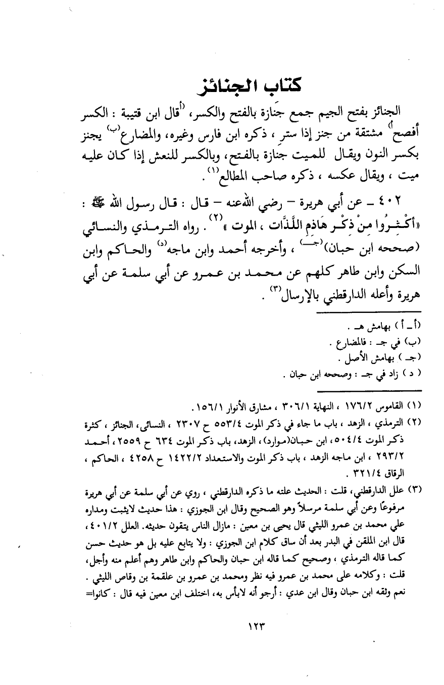 402 - عن أبي هريرة - رضي الله عنه - قال: قال رسول الله - صلى الله عليه وسلم - "أكْثِروا مِنْ ذِكْر هَاذمِ اللَّذَّات، الموت" (¬2). رواه الترمذي والنسائي (صححه ابن حبان) (جـ)، وأخرجه أحمد وابن ماجه (د) والحاكم وابن السكن وابن طاهر كلهم عن محمد بن عمرو عن أبي سلمة عن أبي هريرة وأعله الدارقطني بالإرسال (¬3).