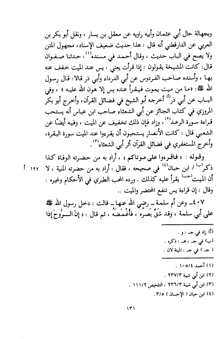 وبجهالة حال أبي عثمان وأبيه راويه عن معقل بن يسار، ونقل أبو بكر بن العربي عن الدارقطني أنه قال: هذا حديث ضعيف، الإسناد، مجهول المتن ولا يصح في الباب حديث، وقال أحمد في مسنده (¬1): حدثنا صفوان قال: كانت المشيخة يقولون: إذا قرأت يعني: يس عند الميت خفف عنه بها، وأسنده صاحب الفردوس عن أبي الدرداء وأبي ذر قالا: قال رسول الله - صلى الله عليه وسلم -: "ما من ميت يموت فيقرأ عنده يس إلا هون الله عليه"، وفي الباب عن أبي ذر (أ) أخرجه أبو الشيخ في فضائل القرآن، وأخرج أبو بكر المروزي في كتاب الجنائز عن أبي الشعثاء صاحب ابن عباس أنه يستحب قراءة سورة الرعد (¬2)، وزاد فإن ذلك تخفيف عن الميت، وفيه أيضًا عن الشعبي قال: كانت الأنصار يستحبون أن يقرءوا عند الميت سورة البقرة، وأخرج المستغفري في فضائل القرآن أثر أبي الشعثاء (¬3).
