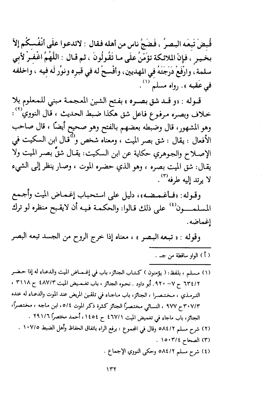 (¬1) مسلم، بلفظ: (يؤمنون) كتاب الجنائز، باب في إغماض الميت والدعاء له إذا حضر 2/ 634 ح 7 - 920. أبو داود. نحوه الجنائز، باب تغميض الميت 3/ 487 ح 3118، الترمذي، مختصرًا، الجنائز، باب ما جاء في تلقين المريض عند الموت والدعاء له عنده 3/ 307 ح 977، النسائي مختصرًا الجنائز كثرة ذكر الموت 4/ 5، ابن ماجه، مختصرًا، الجنائز، باب ما جاء في تغميض الميت 1/ 467 ح 1454، أحمد مختصرًا 6/ 291.