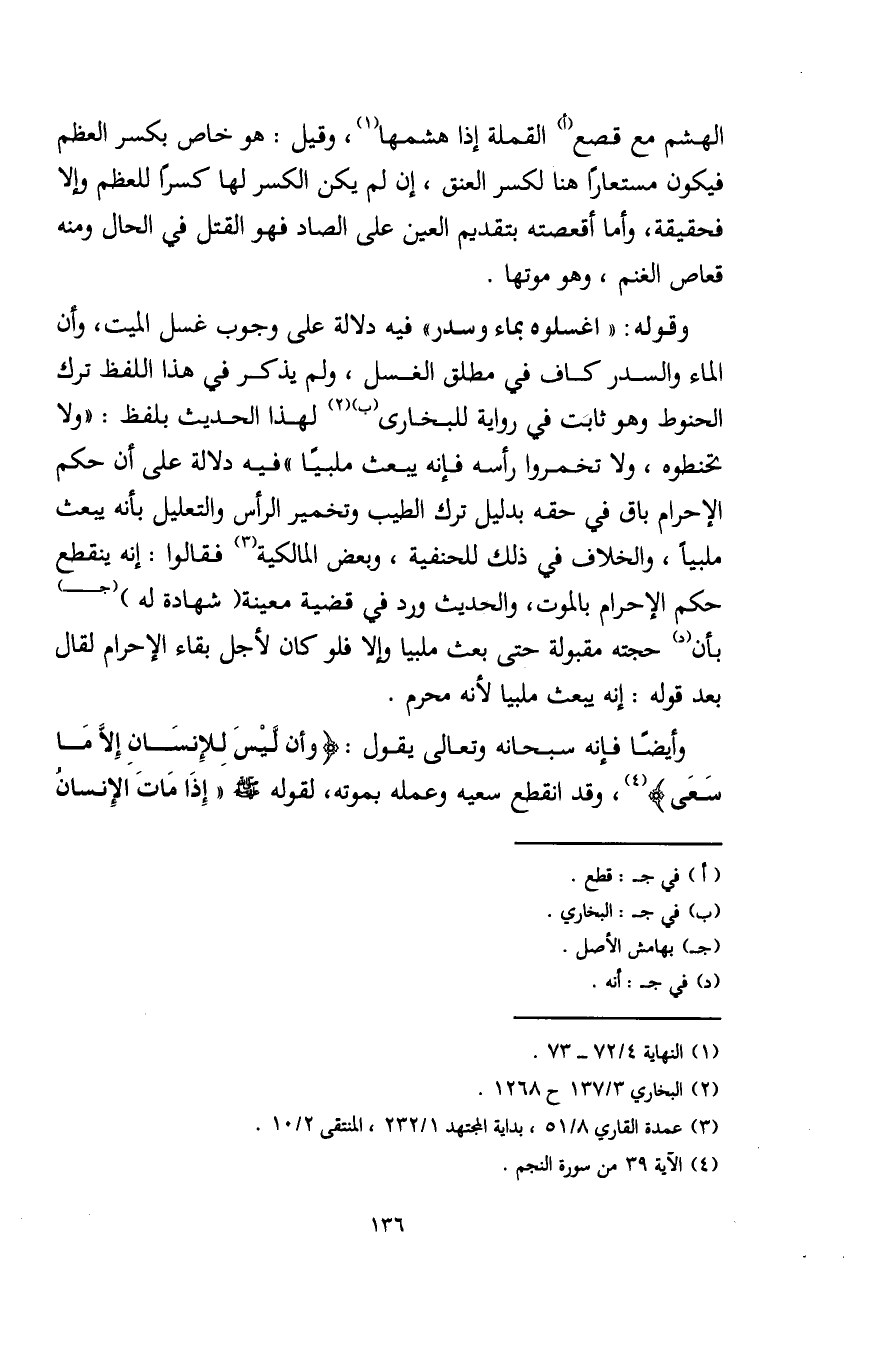 وقوله: "اغسلوه بماء وسدر" فيه دلالة على وجوب غسل الميت، وأن الماء والسدر كاف في مطلق الغسل، ولم يذكر في هذا اللفظ ترك الحنوط وهو ثابت في رواية للبخاري (ب) (¬2) لهذا الحديث بلفظ: "ولا تحنطوه، ولا تخمروا رأسه فإنه يبعث ملبيًا" فيه دلالة على أن حكم الإحرام باق في حقه بدليل ترك الطيب وتخمير الرأس والتعليل بأنه يبعث ملبيًا، والخلاف في ذلك للحنفية، وبعض المالكية (¬3) فقالوا: إنه ينقطع حكم الإحرام بالموت، والحديث ورد في قضية معينة (شهادة له) (جـ) بأن (د) حجته مقبولة حتى بعث ملبيا وإلا فلو كان لأجل بقاء الإحرام لقال بعد قوله: إنه يبعث ملبيا لأنه محرم.