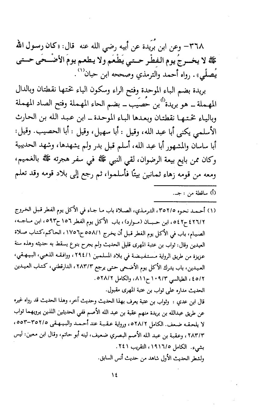 (¬1) أحمد نحوه 5/ 352، الترمذي، الصلاة باب ما جاء في الأكل يوم الفطر قبل الخروج 2/ 426 ح 542، ابن حبان (موارد)، باب الأكل يوم الفطر 156 ح 593، ابن ماجه، الصيام، باب في الأكل يوم الفطر قبل أن يخرج 1/ 558 ح 1756، الحاكم، كتاب صلاة العيدين وقال: ثواب بن عتبة المهري قليل الحدبث ولم يجرح بنوع يسقط به حديثه وهذه سنة عزيزة من طريق الرواية مستفيضة في بلاد المسلمين 1/ 294، ووافقه الذهبي، البيهقي، العيدين، باب يترك الأكل يوم الأضحى حتى يرجع 3/ 283، الدارقطني، كتاب العيدين 2/ 45، الطيالسي 3/ 109 ح 811، والكامل 2/ 528.