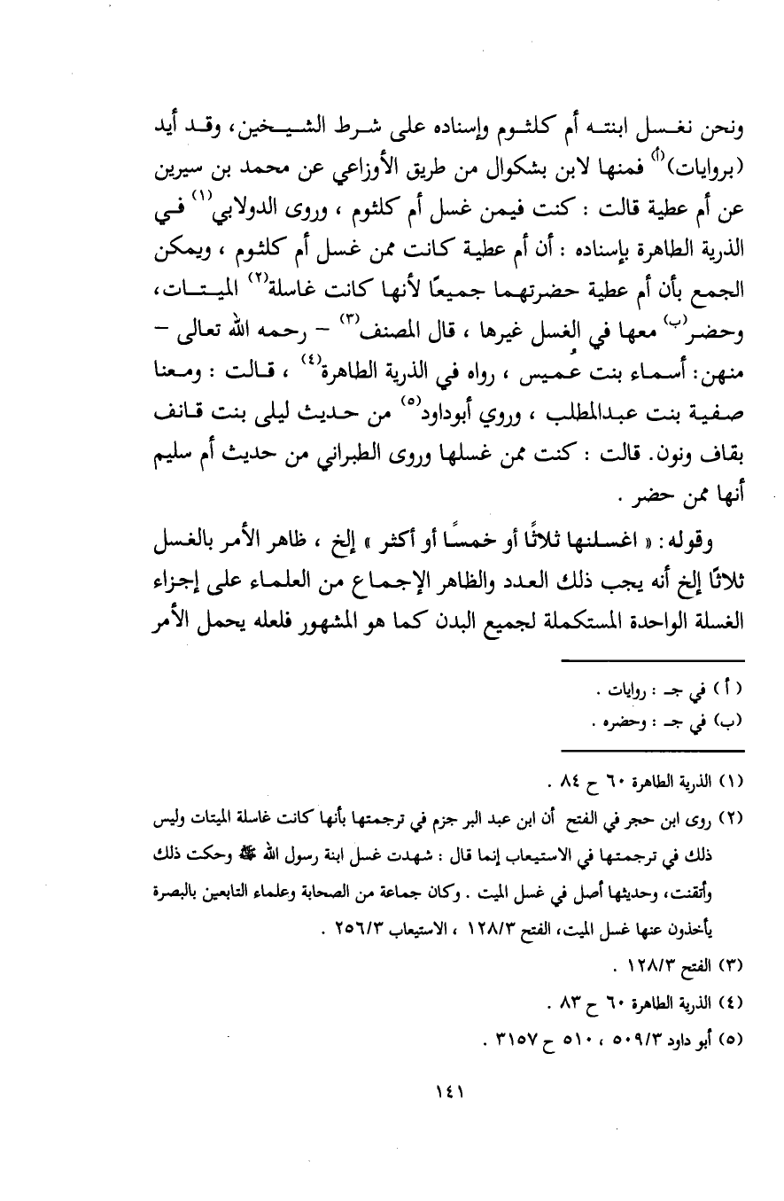 (¬2) روى ابن حجر في الفتح أن ابن عبد البر جزم في ترجمتها بأنها كانت غاسلة الميتات وليس ذلك في ترجمتها في الاستيعاب إنما قال: شهدت غسل ابنة رسول الله - صلى الله عليه وسلم - وحكت ذلك وأتقنت، وحديثها أصل في غسل الميت. وكان جماعة من الصحابة وعلماء التابعين بالبصرة يأخذون عنها غسل الميت، الفتح 3/ 128، الاستيعاب 3/ 256.