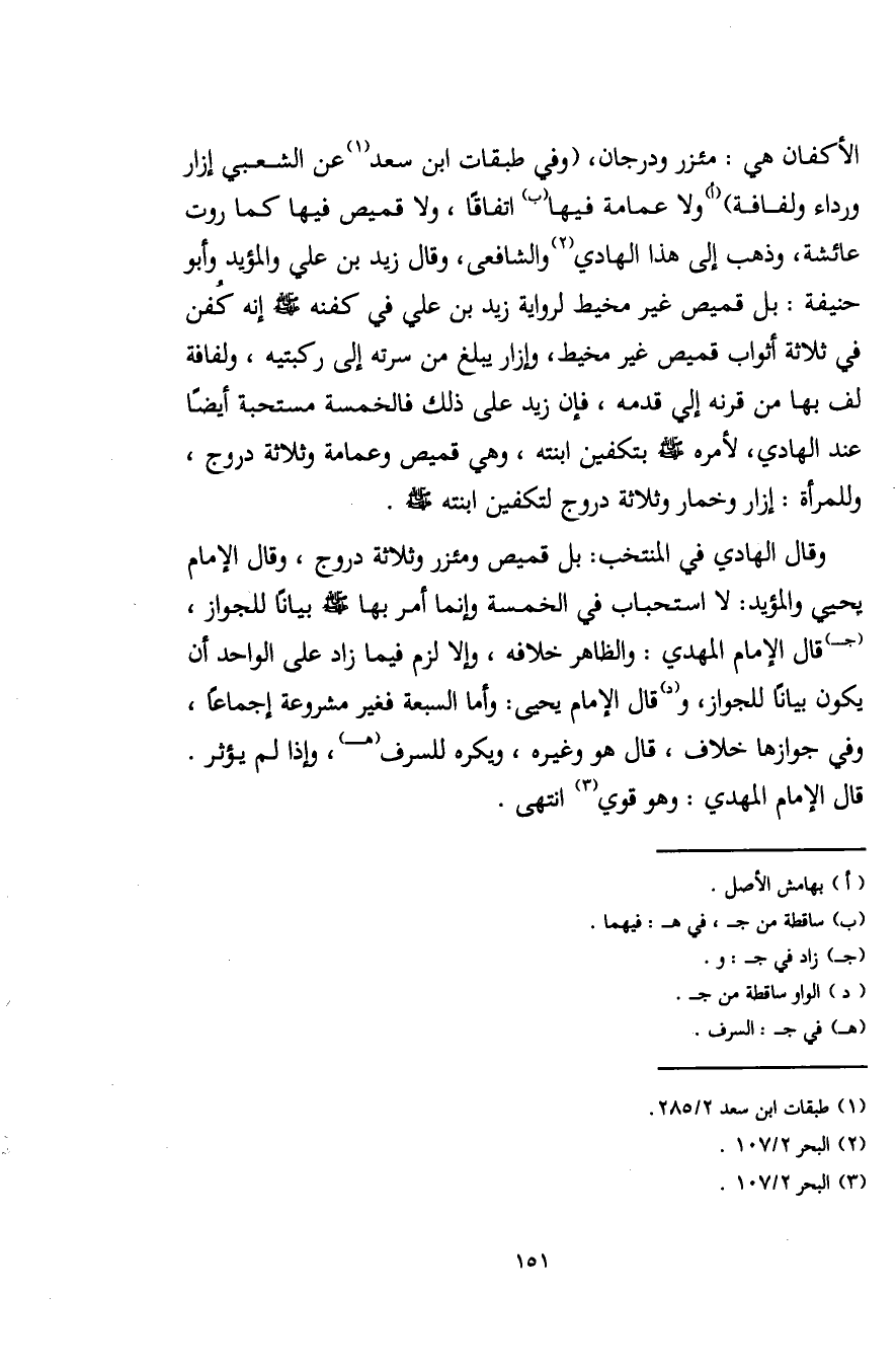 الأكفان هي: مئزر ودرجان، (وفي طبقات ابن سعد (¬1) عن الشعبي إزار ورداء ولفافة) (أ) ولا عمامة فيها (ب) اتفاقًا، ولا قميص فيها كما روت عائشة، وذهب إلى هذا الهادي (¬2) والشافعي، وقال زيد بن علي والمؤيد وأبو حنيفة: بل قميص غير مخيط لرواية زيد بن علي في كفنه - صلى الله عليه وسلم - إنه كُفن في ثلاثة أثواب قميص غير مخيط، وإزار يبلغ من سرته إلى ركبتيه، ولفافة لف بها من قرنه إلى قدمه، فإن زيد على ذلك فالخمسة مستحبة أيضًا عند الهادي، لأمره - صلى الله عليه وسلم - بتكفين ابنته، وهي قميص وعمامة وثلاثة دروج، وللمرأة: إزار وخمار وثلاثة دروج لتكفين ابنته - صلى الله عليه وسلم -.