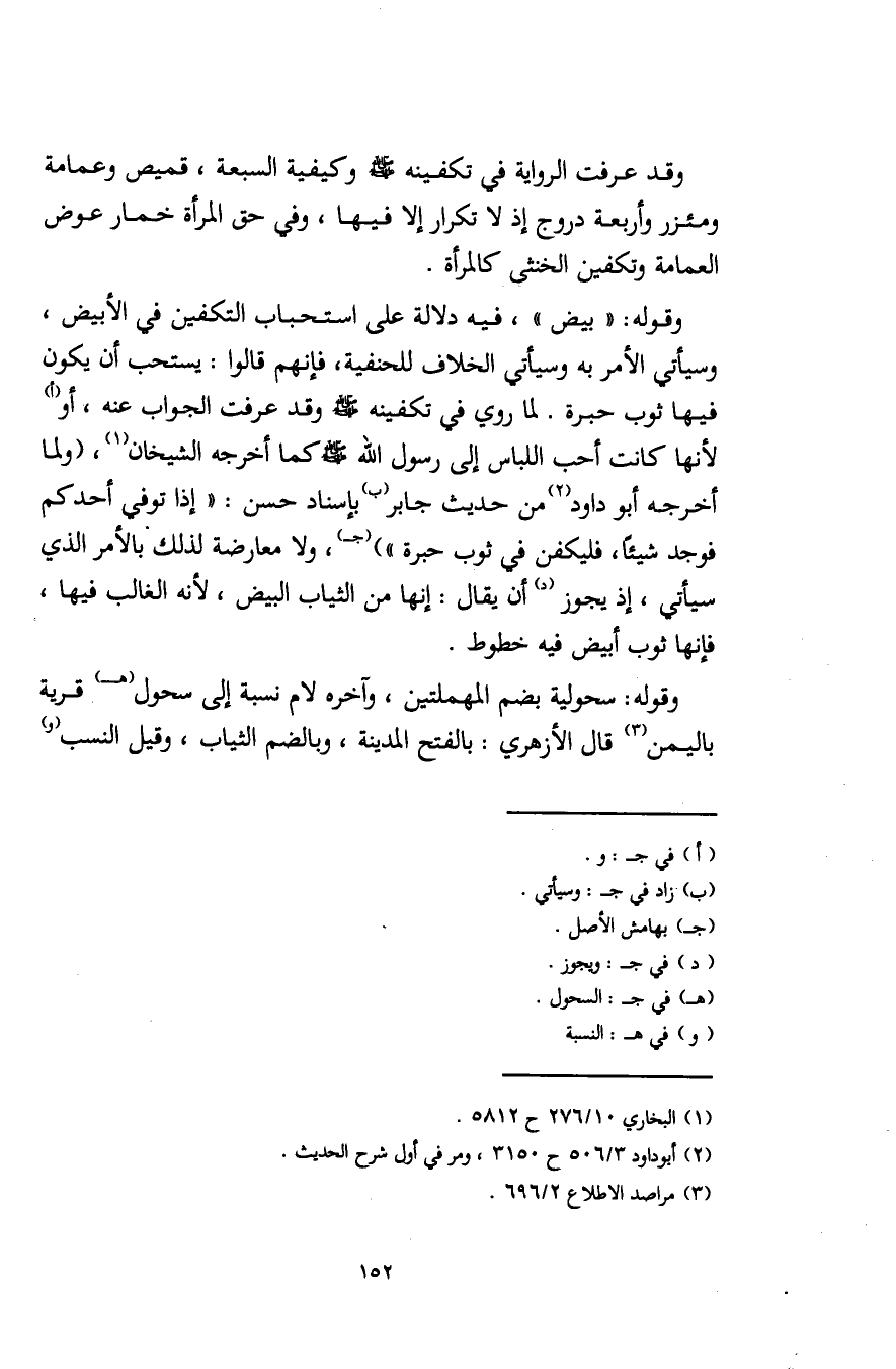 وقوله: "بيض"، فيه دلالة على استحباب التكفين في الأبيض، وسيأتي الأمر به وسيأتي الخلاف للحنفية، فإنهم قالوا: يستحب أن يكون فيها ثوب حبرة. لما روي في تكفينه - صلى الله عليه وسلم - وقد عرفت الجواب عنه، أو (أ) لأنها كانت أحب اللباس إلى رسول الله - صلى الله عليه وسلم - كما أخرجه الشيخان (¬1)، (ولما أخرجه أبو داود (¬2) من حديث جابر (ب) بإسناد حسن: "إذا توفي أحدكم فوجد شيئًا، فليكفن في ثوب حبرة") (جـ)، ولا معارضة لذلك بالأمر الذي سيأتي، إذ يجوز (د) أن يقال: إنها من الثياب البيض؛ لأنه الغالب فيها، فإنها ثوب أبيض فيه خطوط.