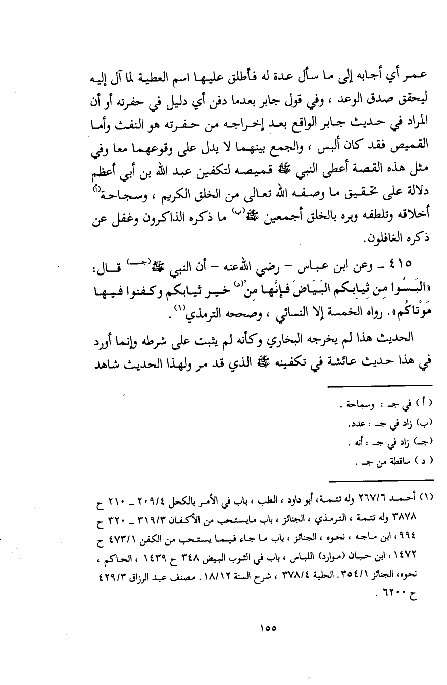 415 - وعن ابن عباس - رضي الله عنه - أن النبي - صلى الله عليه وسلم - (ب) قال "البَسوا مِن ثِياِبكم البَيَاضَ فإِنَّها مِنْ (د) خير ثيابكم وكفنوا فيها مَوْتاكم". رواه الخمسة إلا النسائي، وصححه الترمذي (¬1).