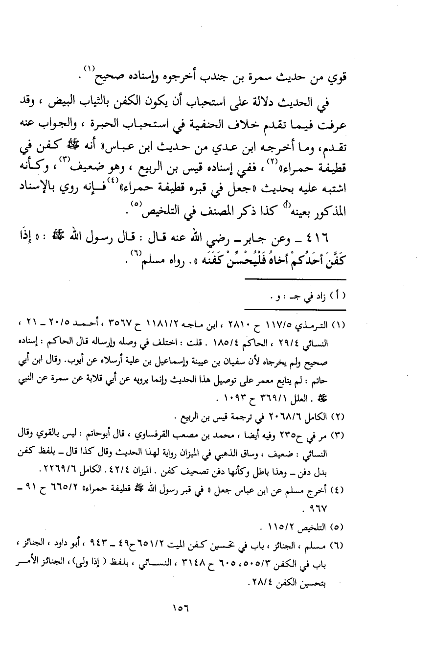 416 - وعن جابر - رضي الله عنه قال: قال رسول الله - صلى الله عليه وسلم -: "إذَا كَفَّنَ أحَدُكمْ أخاهُ فَلْيحْسِّنْ كفَنَه". رواه مسلم (¬6).