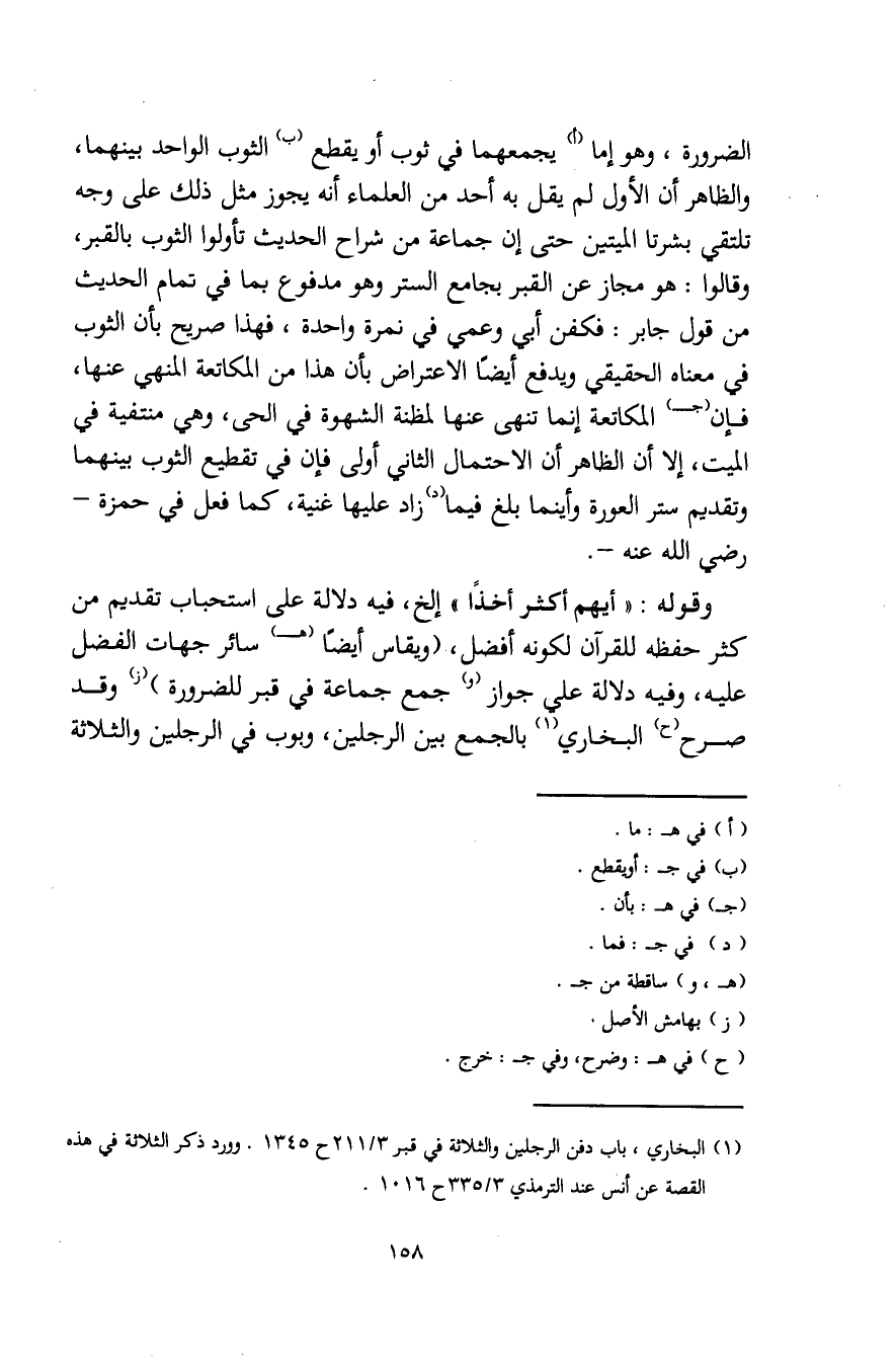 الضرورة، وهو إما (أ) يجمعهما في ثوب أو يقطع (ب) الثوب الواحد بينهما، والظاهر أن الأول لم يقل به أحد من العلماء أنه يجوز مثل ذلك على وجه تلتقي بشرتا الميتين حتى إن جماعة من شراح الحديث تأولوا الثوب بالقبر، وقالوا: هو مجاز عن القبر بجامع الستر وهو مدفوع بما في تمام الحديث من قول جابر: فكفن أبي وعمي في نمرة واحدة، فهذا صريح بأن الثوب في معناه الحقيقي ويدفع أيضًا الاعتراض بأن هذا من المكاتعة المنهي عنها، فإن (جـ) المكاتعة إنما تنهى عنها لمظنة الشهوة في الحي، وهي منتفية في الميت، إلا أن الظاهر أن الاحتمال الثاني أولى فإن في تقطيع الثوب بينهما وتقديم ستر العورة وأينما بلغ فيما (د) زاد عليها غنية، كما فعل في حمزة -رضي الله عنه-.