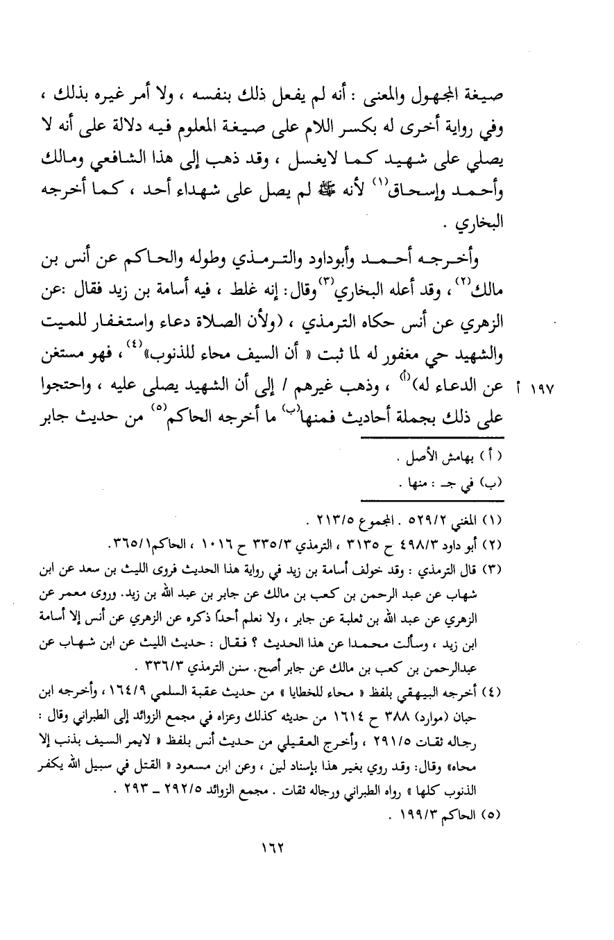 وأخرجه أحمد وأبو داود والترمذي وطوله والحاكم عن أنس بن مالك (¬2)، وقد أعله البخاري (¬3) وقال: إنه غلط، فيه أسامة بن زيد فقال: عن الزهري عن أنس حكاه الترمذي، (ولأن الصلاة دعاء واستغفار للميت والشهيد حي مغفور له لما ثبت "أن السيف محاء للذنوب" (¬4)، فهو مستغن عن الدعاء له) (أ)، وذهب غيرهم إلى أن الشهيد يصلى عليه، واحتجوا على ذلك بجملة أحاديث فمنها (ب) ما أخرجه الحاكم (¬5) من حديث جابر