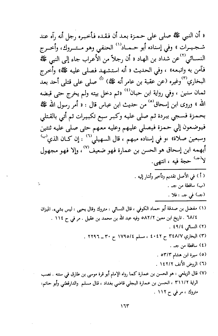 "أن النبي - صلى الله عليه وسلم - صلى على حمزة بعد أن فقده فأخبره رجل أنه رآه عند شجيرات" وفي إسناده أبو حماد (¬1) الحنفي وهو متروك، وأخرج النسائي (¬2) عن شداد بن الهاد "أن رجلًا من الأعراب جاء إلى النبي - صلى الله عليه وسلم - فآمن به واتبعه"، وفي الحديث "أنه استشهد فصلى عليه - صلى الله عليه وسلم -" وأخرج البخاري (¬3) وغيره (عن عقبة بن عامر أنه - صلى الله عليه وسلم -) (أ) صلى على قتلى أحد بعد ثمان سنين، وفي رواية ابن حبان (¬4) "ثم دخل بيته ولم يخرج حتى قبضه الله" وروى ابن إسحاق (¬5) من حديث ابن عباس قال: "أمر رسول الله - صلى الله عليه وسلم - بحمزة فسجي ببردة ثم صلى عليه وكبر سبع تكبيرات ثم أتى بالقتلى فيوضعون إلى حمزة فيصلي عليهم وعليه معهم حتى صلى عليه ثنتين وسبعين صلاة"، وفي إسناده مبهم، قال السهيلي (¬6): إن كان الذي (ب) أبهمه ابن إسحاق هو الحسن بن عمارة فهو ضعيف (¬7)، وإلا فهو مجهول لا (جـ) حجة فيه، انتهى.