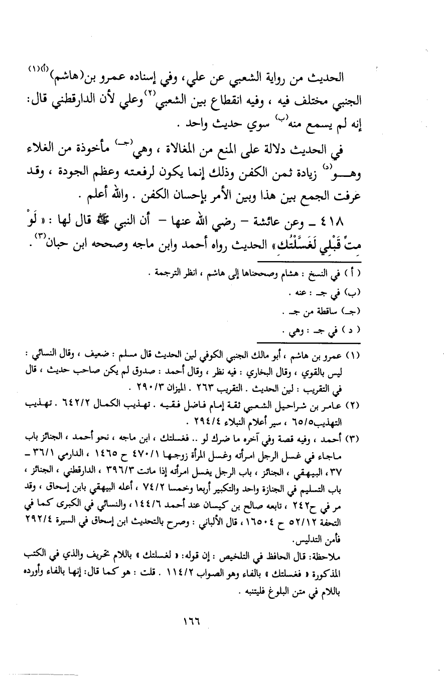 ملاحظة: قال الحافظ في التلخيص: إن قوله: "لغسلتك" باللام تحريف والذي في الكتب المذكورة "فغسلتك" بالفاء وهو الصواب 2/ 114. قلت: هو كما قال: إنها بالفاء وأورده باللام في متن البلوغ فليتنبه.