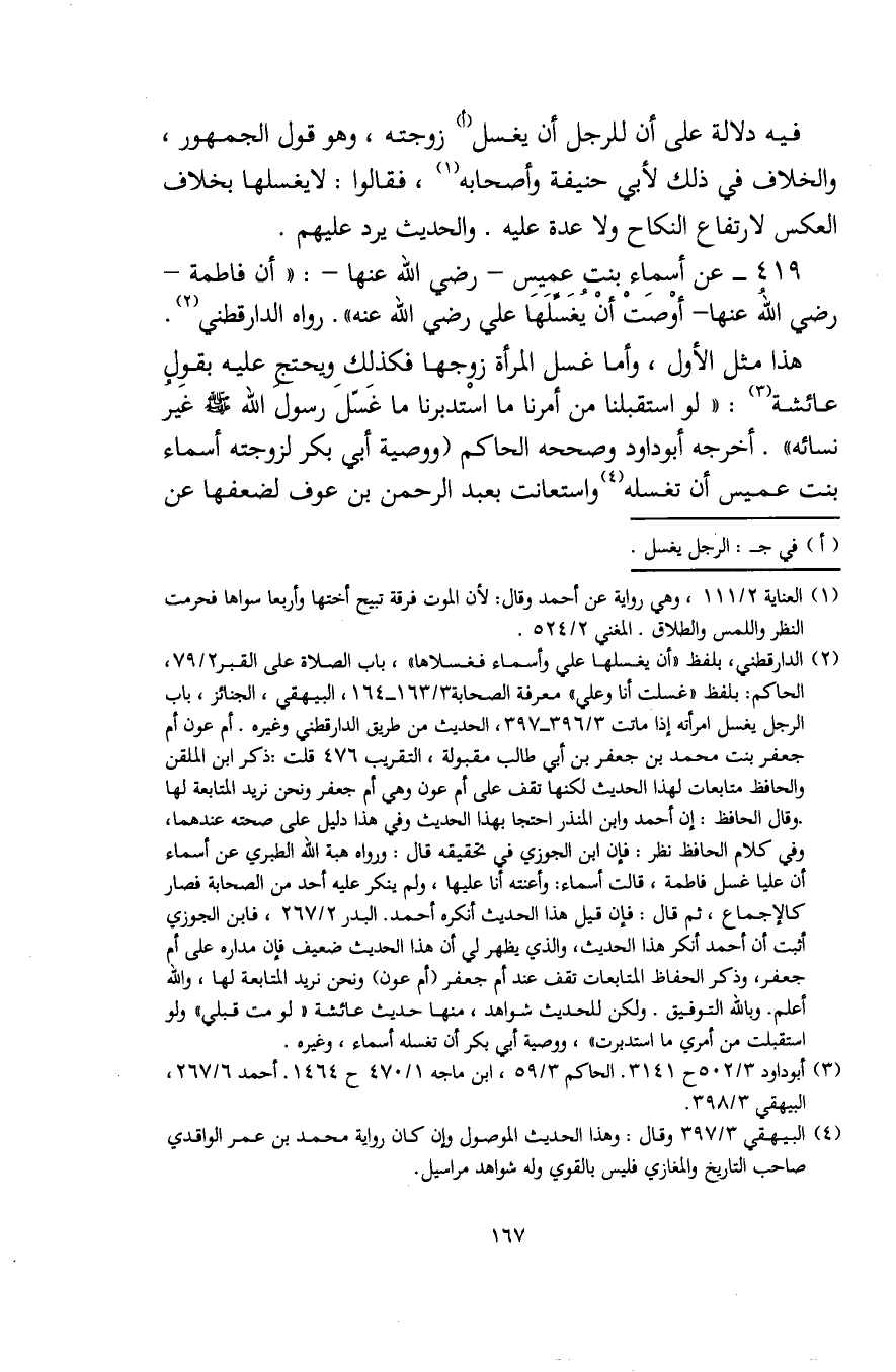 (¬2) الدارقطني، بلفظ "أن يغسلها علي وأسماء فغسلاها"، باب الصلاة على القبر 2/ 79، الحاكم: بلفظ "غسلت أنا وعلي" معرفة الصحابة 3/ 163 - 164، البيهقي، الجنائز، باب الرجل يغسل امرأته إذا ماتت 3/ 396 - 397، الحدبث من طريق الدارقطني وغيره. أم عون أم جعفر بنت محمد بن جعفر بن أبي طالب مقبولة، التقريب 476 قلت: ذكر ابن الملقن والحافظ متابعات لهذا الحديث لكنها تقف على أم عون وهي أم جعفر ونحن نريد المتابعة لها وقال الحافظ: إن أحمد وابن المنذر احتجا بهذا الحديث وفي هذا دليل على صحته عندهما، وفي كلام الحافظ نظر: فإن ابن الجوزي في تحقيقه قال: ورواه هبة الله الطبري عن أسماء أن عليا غسل فاطمة، قالت أسماء: وأعنته أنا عليها، ولم ينكر عليه أحد من الصحابة فصار كالإجماع، ثم قال: فإن قيل هذا الحديث أنكره أحمد. البدر 2/ 267، فابن الجوزي أثبت أن أحمد أنكر هذا الحديث، والذي يظهر لي أن هذا الحديث ضعيف فإن مداره على أم جعفر، وذكر الحفاظ المتابعات تقف عند أم جعفر (أم عون) ونحن نريد المتابعة لها، والله أعلم. وبالله النوفيق. ولكن للحديث شواهد، منها حديث عائشة "لو مت قبلي" ولو استقبلت من أمري ما استدبرت"، ووصية أبي بكر أن تغسله أسماء، وغيره.