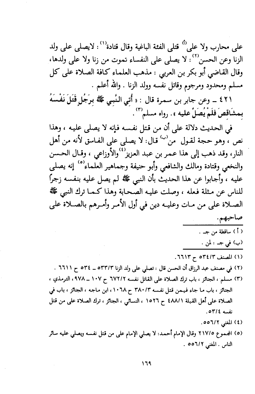 (¬3) مسلم، الجنائز، باب ترك الصلاة على القاتل نفسه 2/ 672 ح 107 - 978، الترمذي، الجنائز، باب ما جاء فيمن قتل نفسه 3/ 380 ح 1068، ابن ماجه، الجنائز، باب في الصلاة على أهل القبلة 1/ 488 ح 1526، النسائي، الجنائز، ترك الصلاة على من قتل نفسه 4/ 53.