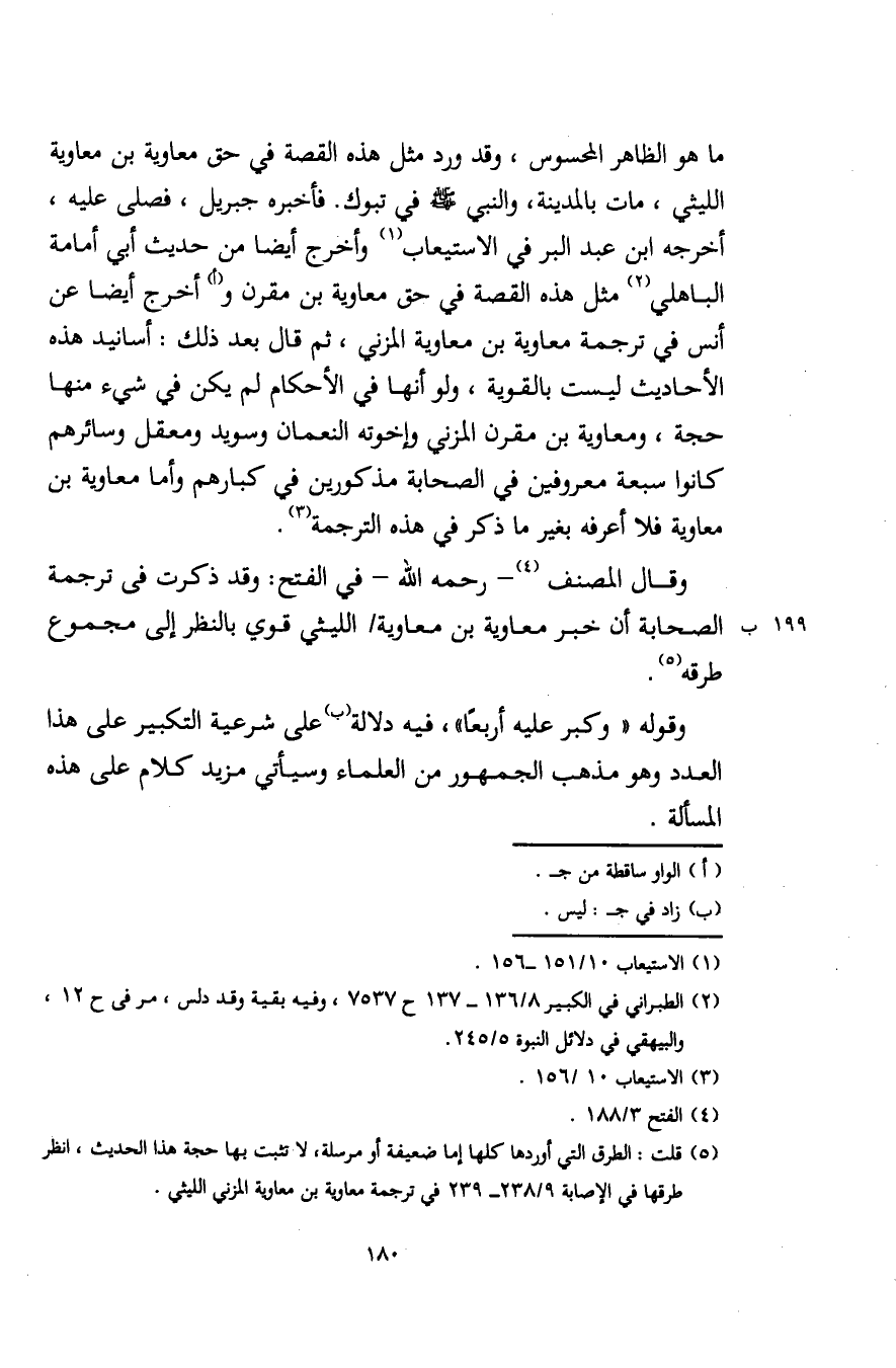 ما هو الظاهر المحسوس، وقد ورد مثل هذه القصة في حق معاوية بن معاوية الليثي، مات بالمدينة، والنبي - صلى الله عليه وسلم - في تبوك. فأخبره جبريل، فصلى عليه، أخرجه ابن عبد البر في الاستيعاب (¬1) وأخرج أيضًا من حديث أبي أمامة الباهلي (¬2) مثل هذه القصة في حق معاوية بن مقرن و (أ) أخرج أيضًا عن أنس في ترجمة معاوية بن معاوية المزني، ثم قال بعد ذلك: أسانيد هذه الأحاديث ليست بالقوية، ولو أنها في الأحكام لم يكن في شيء منها حجة، ومعاوية بن مقرن المزني وإخوته النعمان وسويد ومعقل وسائرهم كانوا سبعة معروفين في الصحابة مذكورين في كبارهم وأما معاوية بن معاوية فلا أعرفه بغير ما ذكر في هذه الترجمة (¬3).