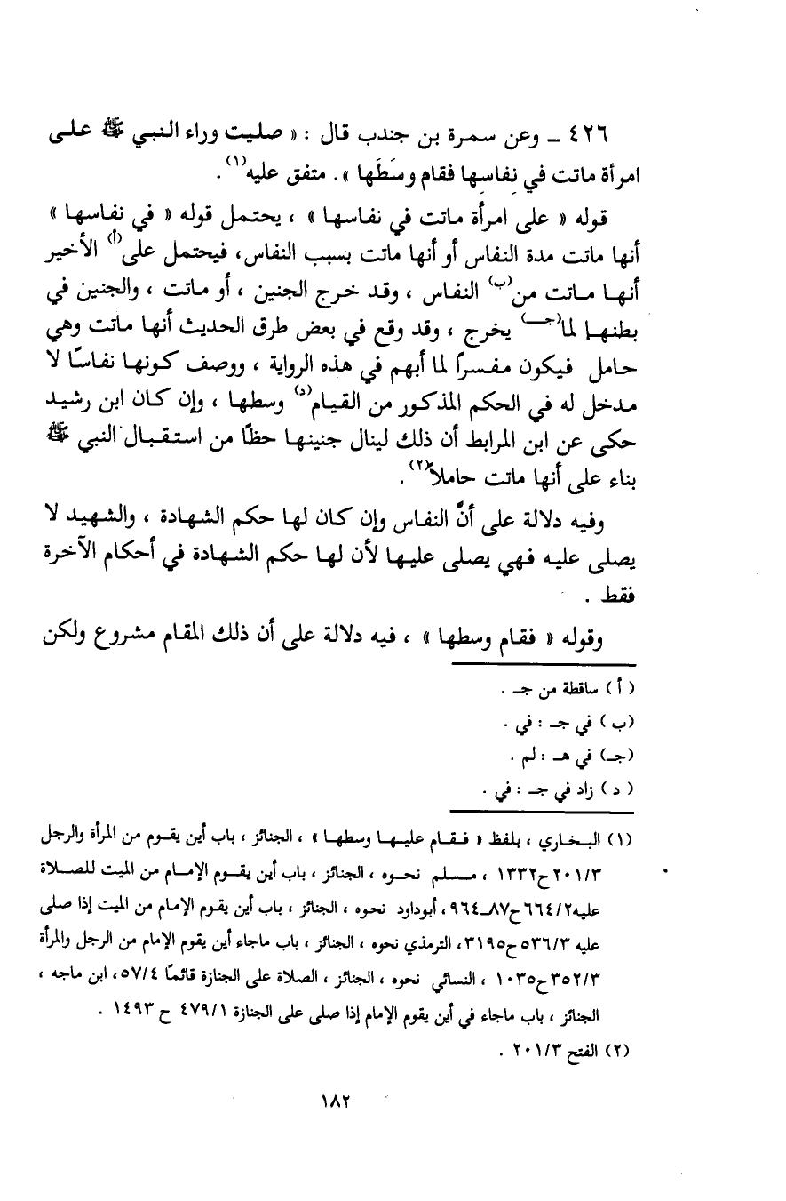 426 - وعن سمرة بن جندب قال: "صليت وراء النبي - صلى الله عليه وسلم - على امرأة ماتت في نِفاسِها فقام وسَطَها". متفق عليه (¬1).