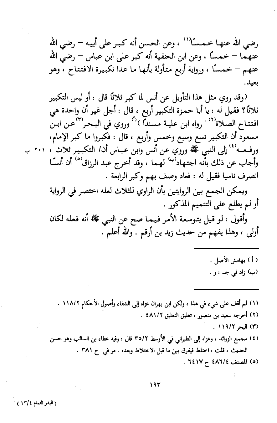 (وقد روي مثل هذا التأويل عن أنس لما كبر ثلاثًا قال: أو ليس التكبير ثلاثًا؟ فقيل له: يا أبا حمزة التكبير أربع، قال: أجل غير أن واحدة هي افتتاح الصلاة (¬2) رواه ابن عليه مسندًا) (أ) وروي في البحر (¬3) عن ابن مسعود أن التكبير تسع وسبع وخمس وأربع، قال: فكبروا ما كبر الإمام، ورفعه (¬4) إلى النبيِّ - صلى الله عليه وسلم - وروي عن أنس وابن عباس أن التكبير ثلاث، وأجاب عن ذلك بأنه اجتهاد (ب) لهما، وقد أخرج عبد الرزاق (¬5) أن أنسًا انصرف ناسيا فقيل له: فعاد وصف بهم وكبر الرابعة.