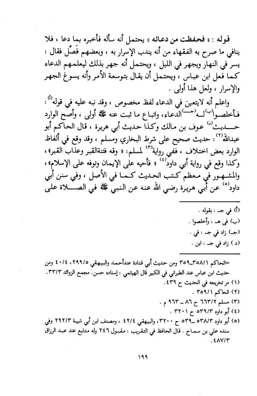واعلم أنه لا يتعين في الدعاء لفظ مخصوص، وقد نبه عليه في قوله (أ): فأخلصوا (ب) له (جـ) الدعاء، واتباع ما ثبت عنه - صلى الله عليه وسلم -أولى، وأصح الوارد حديث (د) عوف بن مالك (¬1) وكذا حديث أبي هريرة، قال الحاكم أبو عبد الله (¬2): حديث صحيح على شرط البخاري ومسلم، وقد وقع في ألفاظ الوارد بعض اختلاف، ففي رواية (¬3) لمسلم: "وقه فتنة القبر وعذاب القبر"، وكذا وقع في رواية أبي داود (¬4) " فأحيه على الإيمان وتوفه على الإسلام"، والمشهور في معظم كتب الحديث كما في الأصل، وفي سنن أبي داود (¬5) عن أبي هريرة رضي الله عنه عن النبيِّ - صلى الله عليه وسلم - في الصلاة على