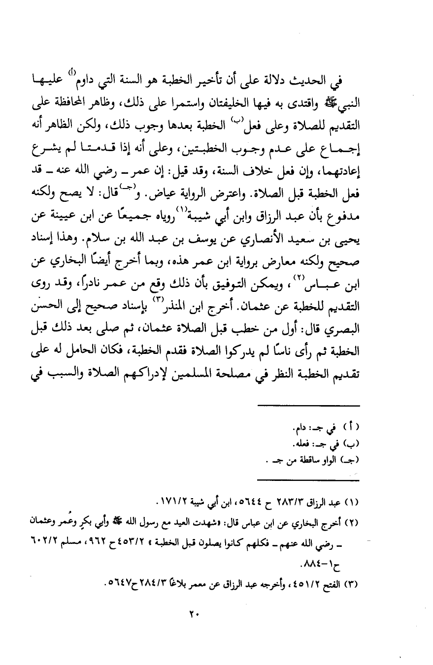 (¬2) أخرج البخاري عن ابن عباس قال: "شهدت العيد مع رسول الله - صلى الله عليه وسلم - وأبي بكرٍ وعُمر وعثمان - رضي الله عنهم - فكلهم كانوا يصلون قبل الخطبة" 2/ 453 ح 962، مسلم 2/ 602 ح 1 - 884.