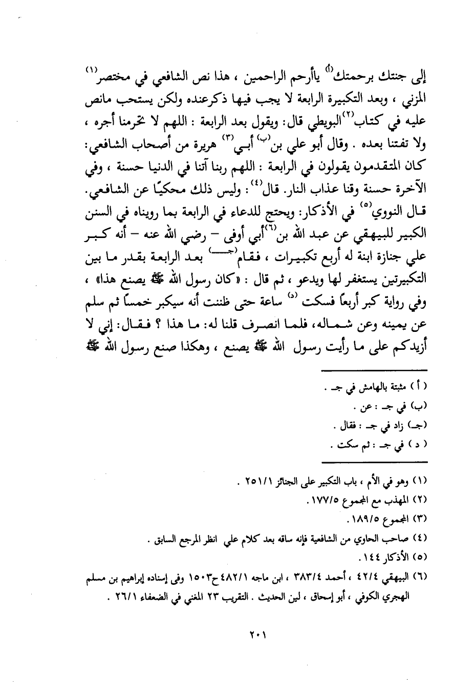 إلى جنتك برحمتك (أ) يا أرحم الراحمين، هذا نص الشافعي في مختصر (¬1) المزني، وبعد التكبيرة الرابعة لا يجب فيها ذكر عنده ولكن يستحب ما نص عليه في كتاب (¬2) البويطي قال: ويقول بعد الرابعة: اللهم لا تحرمنا أجره، ولا تفتنا بعده. وقال أبو علي بن (ب) أبي (¬3) هريرة من أصحاب الشافعي: كان المتقدمون يقولون في الرابعة: اللهم ربنا آتنا في الدنيا حسنة، وفي الآخرة حسنة وقنا عذاب النار. قال (¬4): وليس ذلك محكيًا عن الشافعي. قال النووي (¬5) في الأذكار: ويحتج للدعاء في الرابعة بما رويناه في السنن الكبير للبيهقي عن عبد الله بن (¬6) أبي أوفى - رضي الله عنه - أنه كبر على جنازة ابنة له أربع تكبيرات، فقام (ب) بعد الرابعة بقدر ما بين التكبيرتين يستغفر لها ويدعو، ثم قال: "كان رسول الله - صلى الله عليه وسلم - يصنع هذا"، وفي رواية كبر أربعًا فسكت (د) ساعة حتى ظننت أنه سيكبر خمسًا ثم سلم عن يمينه وعن شماله، فلما انصرف قلنا له: ما هذا؟ فقال: إني لا أزيدكم على ما رأيت رسول الله - صلى الله عليه وسلم - يصنع، وهكذا صنع رسول الله - صلى الله عليه وسلم -