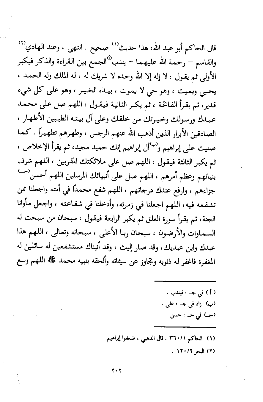 قال الحاكم أبو عبد الله: هذا حديث (¬1) صحيح. انتهى، وعند الهادي (¬2) والقاسم -رحمة الله عليهما- يندب (أ) الجمع بين القراءة والذكر فيكبر الأولى ثم يقول: لا إله إلا الله وحده لا شريك له، له الملك وله الحمد، يحيي ويميت، وهو حي لا يموت، بيده الخير، وهو على كل شيء قدير، ثم يقرأ الفاتحة، ثم يكبر الثانية فيقول: اللهم صل على محمد عبدك ورسولك وخيرتك من خلقك وعلى آل بيته الطيبين الأطهار، الصادقين الأبرار الذين أذهب الله عنهم الرجس، وطهرهم تطهيرًا. كما صليت على إبراهيم و (ب) آل إبراهيم إنك حميد مجيد، ثم يقرأ الإخلاص، ثم يكبر الثالثة فيقول: اللهم صل على ملائكتك المقربين، اللهم شرف بنيانهم وعظم أمرهم، اللهم صل على أنبيائك المرسلين اللهم أحسن (جـ) جزاءهم، وارفع عندك درجاتهم، اللهم شفع محمدًا في أمته واجعلنا ممن تشفعه فيه، اللهم اجعلنا في زمرته، وأدخلنا في شفاعته، واجعل مأوانا الجنة، ثم يقرأ سورة العلق ثم يكبر الرابعة فيقول: سبحان من سبحت له السماوات والأرضون، سبحان ربنا الأعلى، سبحانه وتعالى، اللهم هذا عبدك وابن عبديك، وقد صار إليك، وقد أتيناك مستشفعين له سائلين له المغفرة فاغفر له ذنوبه وتجاوز عن سيئاته وألحقه بنبيه محمد - صلى الله عليه وسلم - اللهم وسع