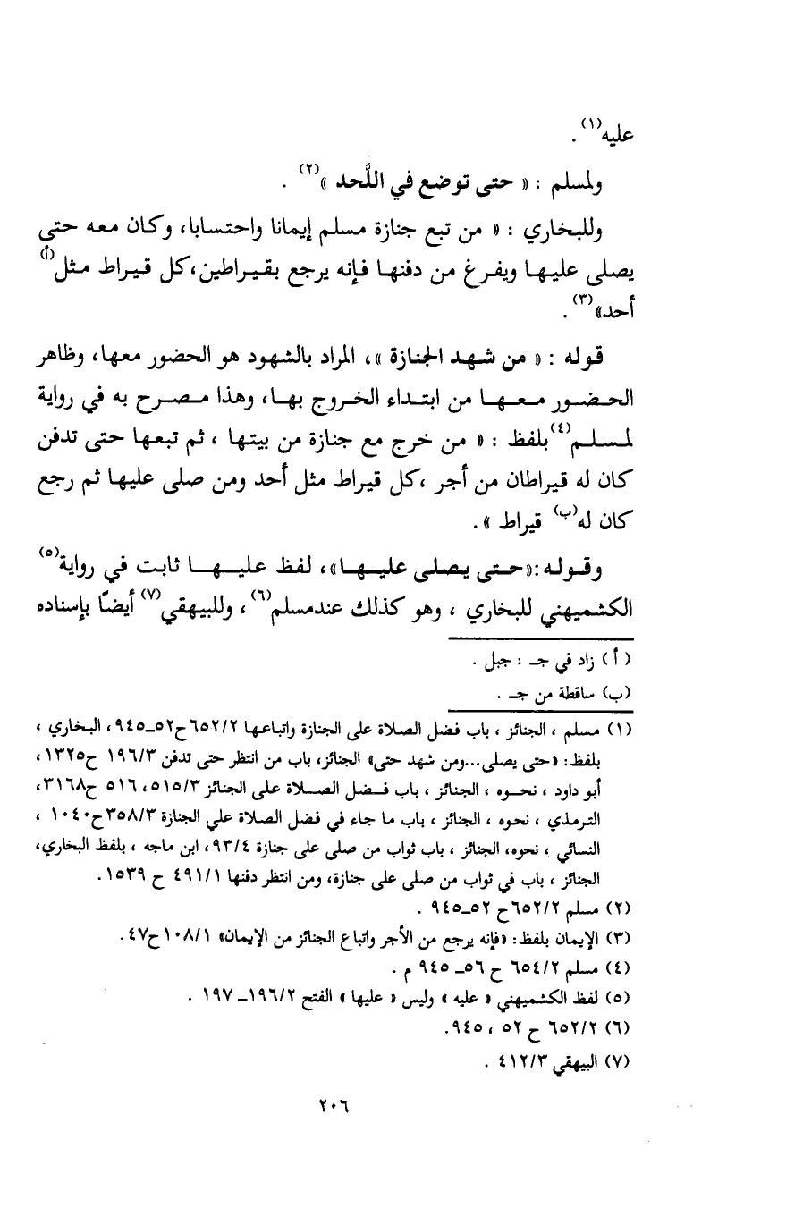 (¬1) مسلم، الجنائز، باب فضل الصلاة على الجنازة واتباعها 2/ 652 ح 52 - 945، البخاري، بلفظ: "حتى يصلى ... ومن شهد حتى" الجنائز، باب من انتظر حتى تدفن 3/ 196 ح 1325، أبو داود، نحوه، الجنائز، باب فضل الصلاة على الجنائز 3/ 515، 516 ح 3168، الترمذي، نحوه، الجنائز، باب ما جاء في فضل الصلاة على الجنازة 3/ 358 ح 1040، النسائي، نحوه، الجنائز، باب ثواب من صلى على جنازة 4/ 93، ابن ماجه، بلفظ البخاري، الجنائز، باب في ثواب من صلى على جنازة، ومن انتظر دفنها 1/ 491 ح 1539.