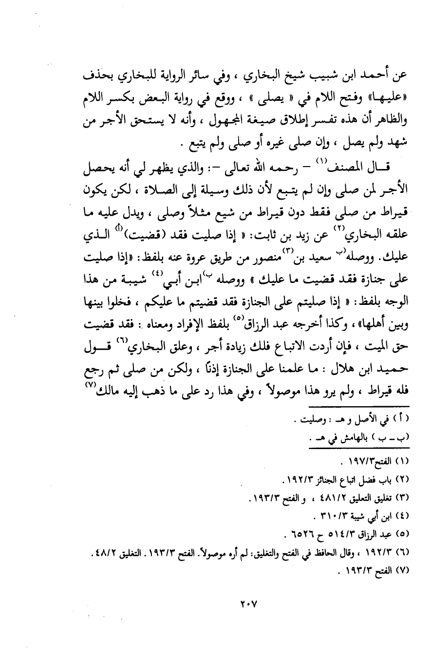 قال المصنف (¬1) -رحمه الله تعالى-: والذي يظهر لي أنه يحصل الأجر لمن صلى وإن لم يتبع لأن ذلك وسيلة إلى الصلاة، لكن يكون قيراط من صلى فقط دون قيراط من شيع مثلًا وصلى، ويدل عليه ما علقه البخاري (¬2) عن زيد بن ثابت: "إذا صليت فقد (قضيت) (أ) الذي عليك. ووصله (ب سعيد بن (¬3) منصور من طريق عروة عنه بلفظ: "إذا صليت على جنازة فقد قضيت ما عليك" ووصله ب) ابن أبي (¬4) شيبة من هذا الوجه بلفظ: "إذا صليتم على الجنازة فقد قضيتم ما عليكم، فخلوا بينها وبين أهلها"، وكذا أخرجه عبد الرزاق (¬5) بلفظ الإفراد ومعناه: فقد قضيت حق الميت، فإن أردت الاتباع فلك زيادة أجر، وعلق البخاري (¬6) قول حميد بن هلال: ما علمنا على الجنازة إذنًا، ولكن من صلى ثم رجع فله قيراط، ولم يرو هذا موصولًا، وفي هذا رد على ما ذهب إليه مالك (¬7)