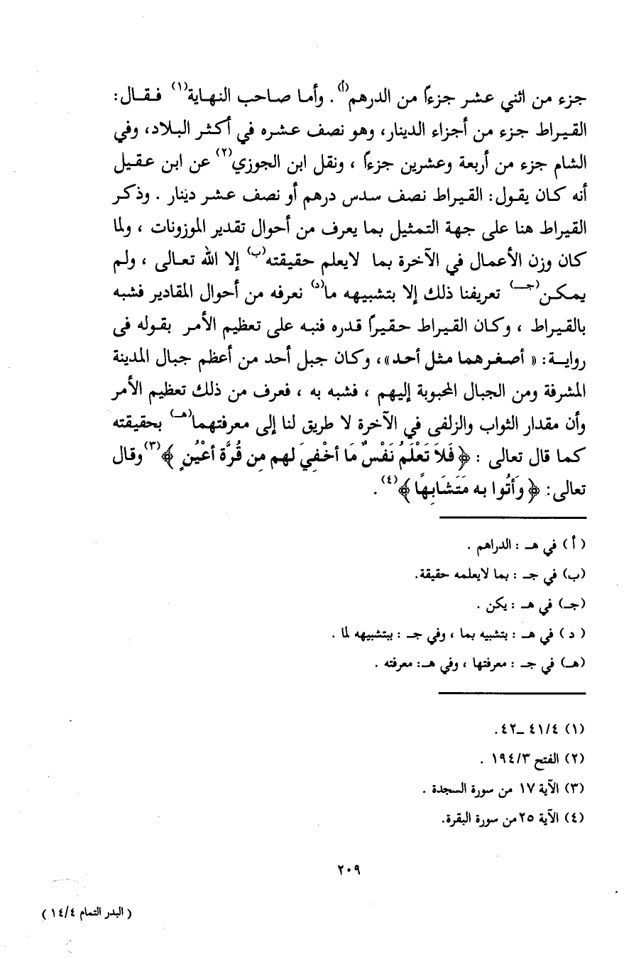 جزء من اثني عشر جزءًا من الدرهم (أ). وأما صاحب النهاية (¬1) فقال: القيراط جزء من أجزاء الدينار، وهو نصف عشره في أكثر البلاد، وفي الشام جزء من أربعة وعشرين جزءًا، ونقل ابن الجوزي (¬2) عن ابن عقيل أنه كان يقول: القيراط نصف سدس درهم أو نصف عشر دينار. وذكر القيراط هنا على جهة التمثيل بما يعرف من أحوال تقدير الموزونات، ولما كان وزن الأعمال في الآخرة بما لا يعلم حقيقته (ب) إلا الله تعالى، ولم يمكن (جـ) تعريفنا ذلك إلا بتشبيهه ما (د) نعرفه من أحوال المقادير فشبه بالقيراط، وكان القيراط حقيرًا قدره فنبه على تعظيم الأمر بقوله في رواية: "أصغرهما مثل أحد"، وكان جبل أحد من أعظم جبال المدينة المشرفة ومن الجبال المحبوبة إليهم، فشبه به، فعرف من ذلك تعظيم الأمر وأن مقدار الثواب والزلفى في الآخرة لا طريق لنا إلى معرفتهما (هـ) بحقيقته كما قال تعالى: {فَلَا تَعْلَمُ نَفْسٌ مَا أُخْفِيَ لَهُمْ مِنْ قُرَّةِ أَعْيُنٍ} (¬3) وقال تعالى: {وَأُتُوا بِهِ مُتَشَابِهًا} (¬4).