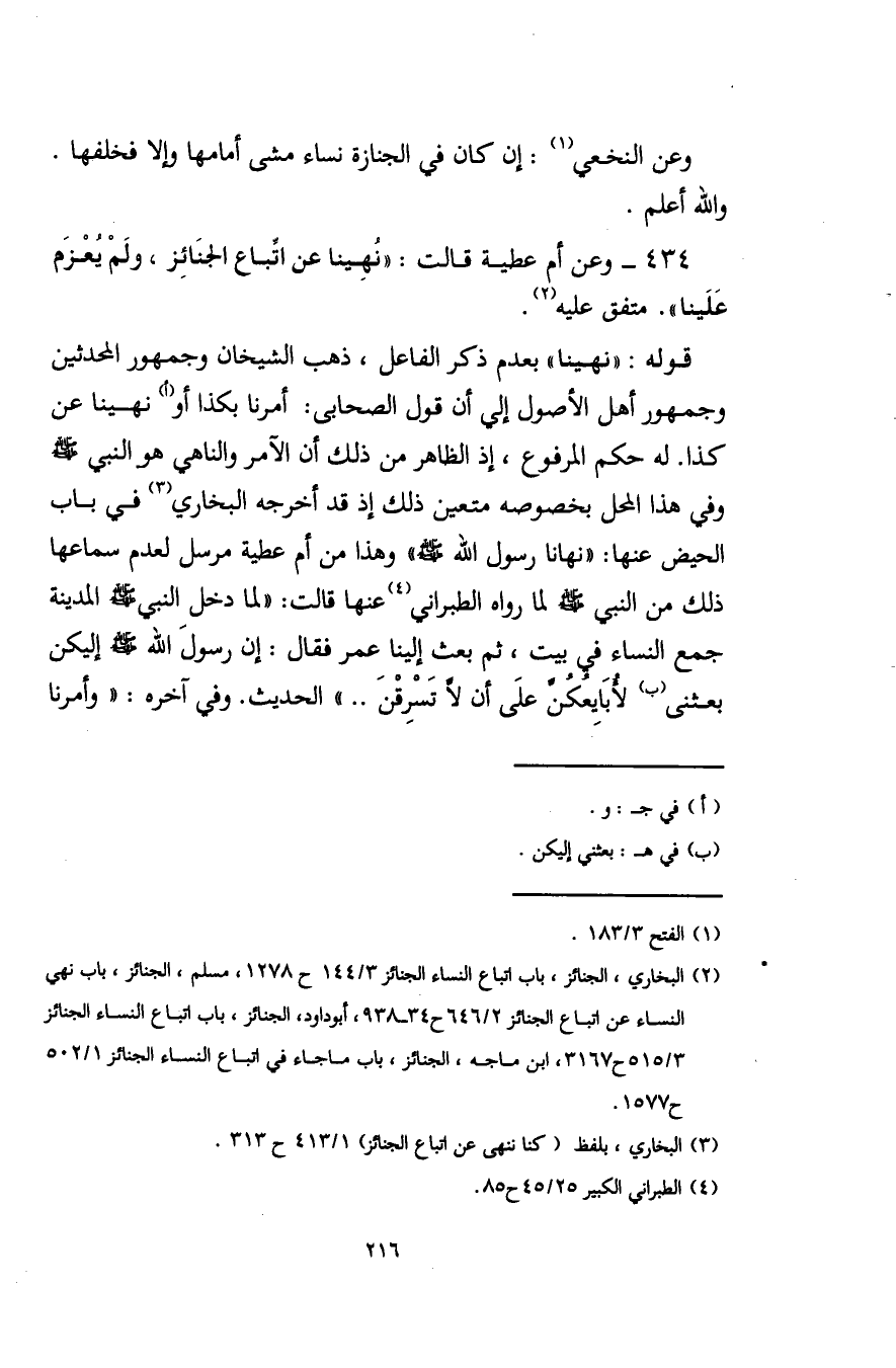 (¬2) البخاري، الجنائز، باب اتباع النساء الجنائز 3/ 144 ح 1278، مسلم، الجنائز، باب نهي النساء عن اتباع الجنائز 2/ 646 ح 34 - 938، أبو داود، الجنائز، باب اتباع النساء الجنائز 3/ 515 ح 3167، ابن ماجه، الجنائز، باب ما جاء في اتباع النساء الجنائز 1/ 502 ح 1577.