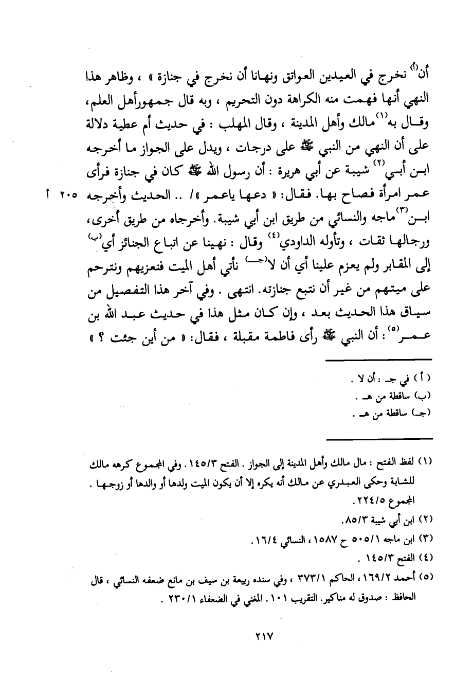 (¬1) لفظ الفتح: مال مالك وأهل المدينة إلى الجواز. الفتح 3/ 145. وفي المجموع كرهه مالك للشابة وحكى العبدري عن مالك أنه يكره إلا أن يكون الميت ولدها أو والدها أو زوجها. المجموع 5/ 224.