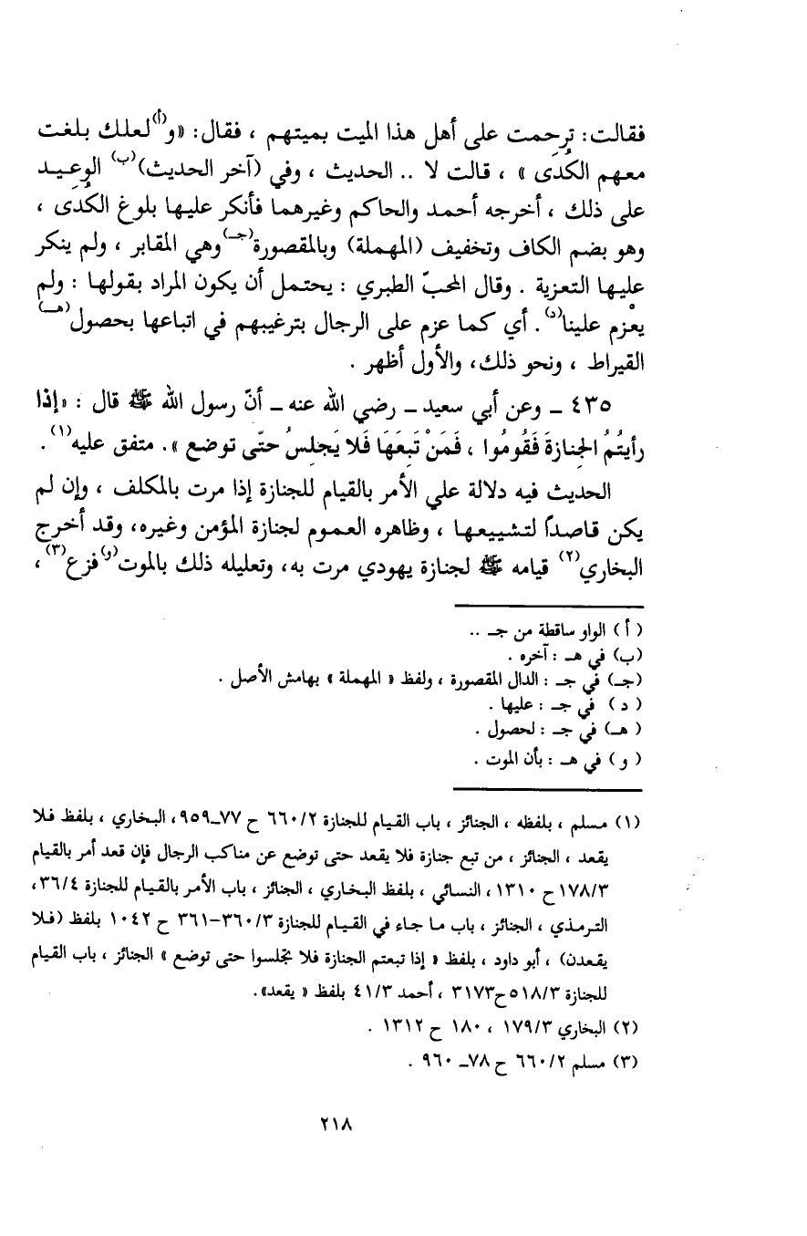 (¬1) مسلم، بلفظه، الجنائز، باب القيام للجنازة 2/ 660 ح 77 - 959، البخاري، بلفظ فلا يقعد، الجنائز، من تبع جنازة فلا يقعد حتى توضع عن مناكب الرجال فإن قعد أمر بالقيام 3/ 178 ح 1310، النَّسائي، بلفظ البخاري، الجنائز، باب الأمر بالقيام للجنازة 4/ 36، الترمذي، الجنائز، باب ما جاء في القيام للجنازة 3/ 360 - 361 ح 1042 بلفظ (فلا يقعدن)، أبو داود، بلفظ "إذا تبعتم الجنازة فلا تجلسوا حتى توضع" الجنائز، باب القيام للجنازة 3/ 518 ح 3173، أحمد 3/ 41 بلفظ "يقعد".