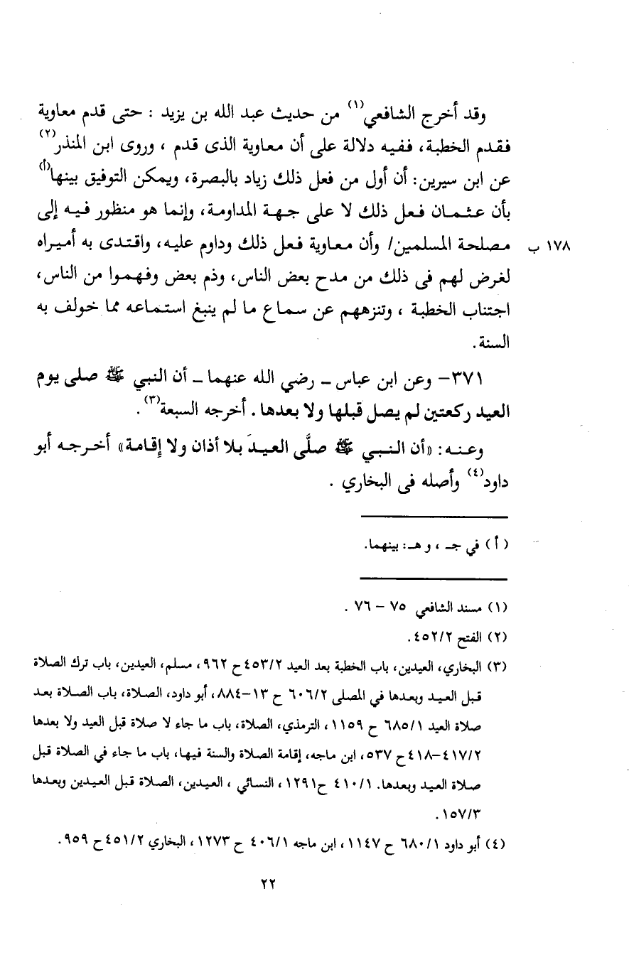 371 - وعن ابن عباس - رضي الله عنهما - أن النبي - صلى الله عليه وسلم - صلى يوم العيد ركعتين لم يصل قبلها ولا بعدها. أخرجه السبعة (¬3).