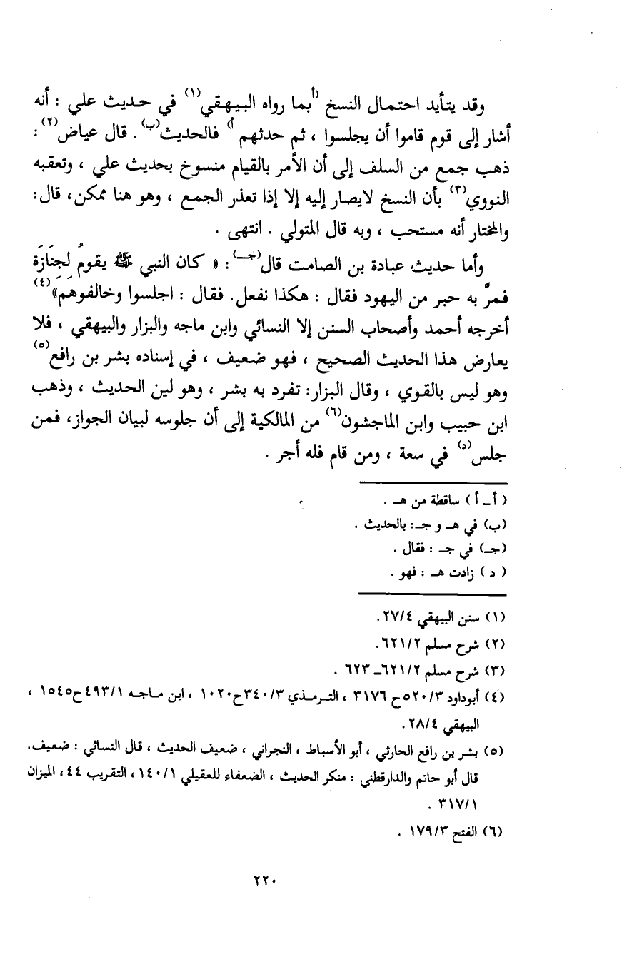 وأما حديث عبادة بن الصامت قال (ب): "كان النبي - صلى الله عليه وسلم - يقومُ لِجنَازَة فمرَّ به حبر من اليهود فقال: هكذا نفعل. فقال: اجلسوا وخالفوهم" (¬4) أخرجه أحمد وأصحاب السنن إلا النسائي وابن ماجه والبزار والبيهقي، فلا يعارض هذا الحديث الصحيح، فهو ضعيف، في إسناده بشر بن رافع (¬5) وهو ليس بالقوي، وقال البزار: تفرد به بشر، وهو بين الحديث، وذهب ابن حبيب وابن الماجشون (¬6) من المالكية إلى أن جلوسه لبيان الجواز، فمن جلس (د) في سعة، ومن قام فله أجر.