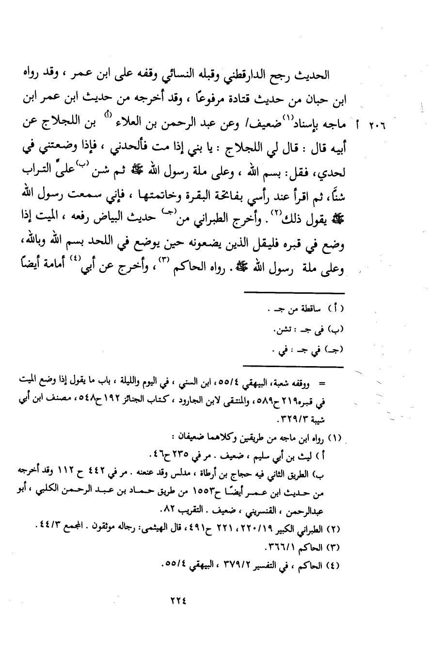الحديث رجع الدارقطني وقبله النسائي وقفه على ابن عمر، وقد رواه ابن حبان من حديث قتادة مرفوعًا، وقد أخرجه من حديث بن عمر ابن ماجه بإسناد (¬1) ضعيف وعن عبد الرحمن بن العلاء (أ) بن اللجلاج عن أبيه قال: قال: قال لي اللجلاج: يا بني إذا مت فألحدني، فإذا وضعتني في لحدي، فقل: بسم الله، وعلى ملة رسول الله - صلى الله عليه وسلم - ثم شن (ب) عليَّ التراب شنًّا، ثم اقرأ عند رأسي بفاتحة البقرة وخاتمتها، فإني سمعت رسول الله - صلى الله عليه وسلم - يقول ذلك (¬2). وأخرج الطبراني من (جـ) حديث البياض رفعه، الميت إذا وضح في قبره فليقل الذين يضعونه حين يوضع في اللحد بسم الله وبالله، وعلى ملة رسول الله - صلى الله عليه وسلم -. رواه الحاكم (¬3)، وأخرج عن أبي (¬4) أمامة أيضًا