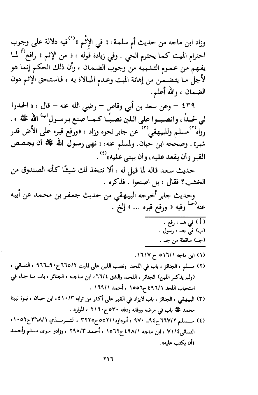 (¬2) مسلم، الجنائز، باب في اللحد ونصب اللبن على الميت 2/ 665 ح 90 - 966، النسائي، (ولم يذكر اللبن) الجنائز، اللحد والشق 4/ 66، ابن ماجه، الجنائز، باب ما جاء في استحباب اللحد 1/ 496 ح 1556، أحمد 1/ 169.