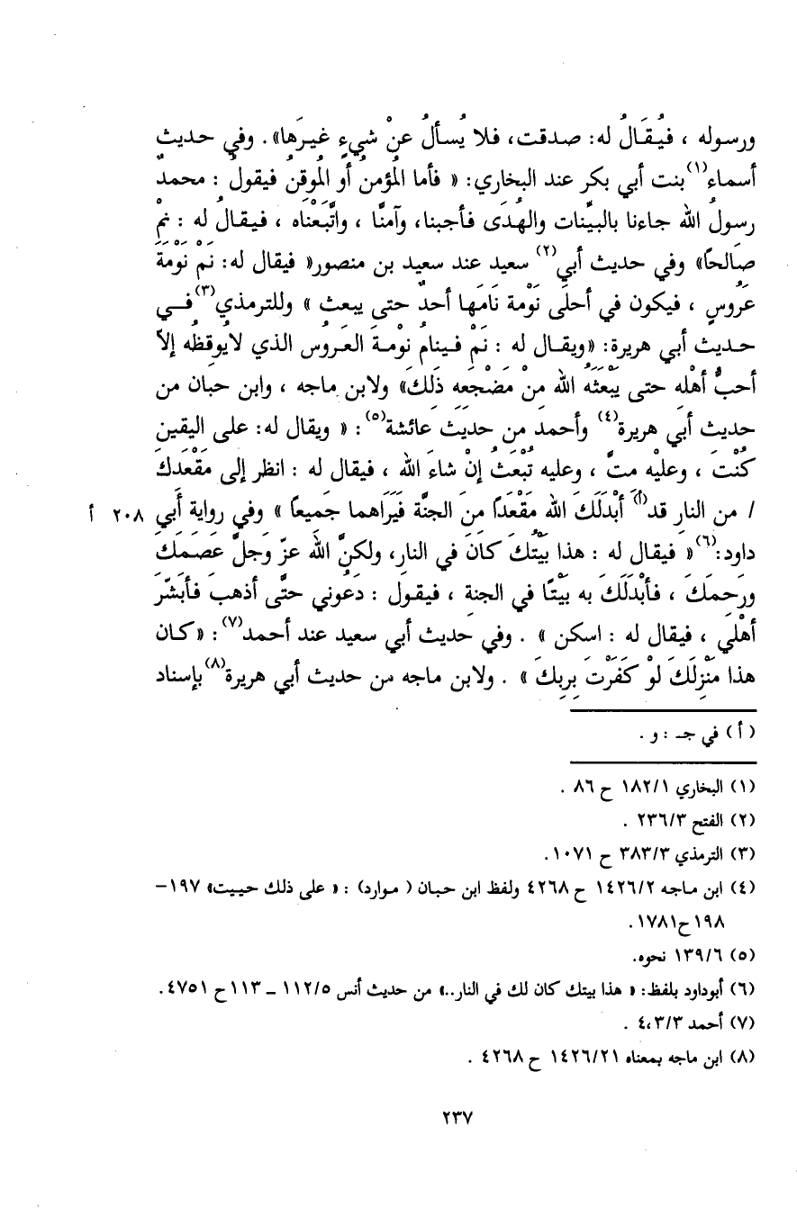ورسوله، فيُقَالُ له: صدقت، فلا يُسألُ عنْ شيءٍ غيرَها". وفي حديث أسماء (¬1) بنت أبي بكر عند البخاري: "فأما المُؤمنُ أو المُوقِنُ فيقول: محمدٌ رسولُ الله جاءنا بالبيِّنات والهُدَى فأجبنا، وآمنا، واتبَعناه، فيقالُ له. نم صَالحا" وفي حديث أبي (¬2) سعيد عند سعيد بن منصور" فيقال له: نم نومة عَرُوسٍ، فيكون في أحلى نَوْمة نَامَها أحدٌ حتى يبعث" وللترمذي (¬3) في حديث أبي هريرة: "ويقال له: نم فينامُ نوْمةَ العَروُس الذي لا يُوقِظُه إلَّا أحبُّ أهْله حتى يبعَثَهُ الله مِنْ مَضْجعِهِ ذَلكَ" ولابن ماجه، وابن حبان من حديث أبي هريرة (¬4) وأحمد من حديث عائشة (¬5): "ويقال له: على اليقين كُنْتَ، وعليْه متَّ، وعليه تبْعَثُ إنْ شاءَ الله، فيقال له: انظر إلى مَقْعَدكَ من النار قد (أ) أبْدَلَكَ الله مَقْعَدًا منَ الجنة فَيَرَاهما جَميعًا" وفي رواية أَبي داود: (¬6) "فيقال له: هذا بيتكَ كان في النارِ، ولكِن اللَّه عزّ وجل عَصَمِكِ ورحمَكَ، فأبْدلَكَ به بيتًا في الجنةِ، فيقول: دعُوني حتى أذهبَ فأبشر أهْلي، فيقال له: اسِكن". وفي حديث أبي سعيد عند أحمد (¬7): "كان هذا منزِلَكَ لوْ كَفَرت بِرِبكَ". ولابن ماجه كان حديث أبي هريرة (¬8) بإسناد