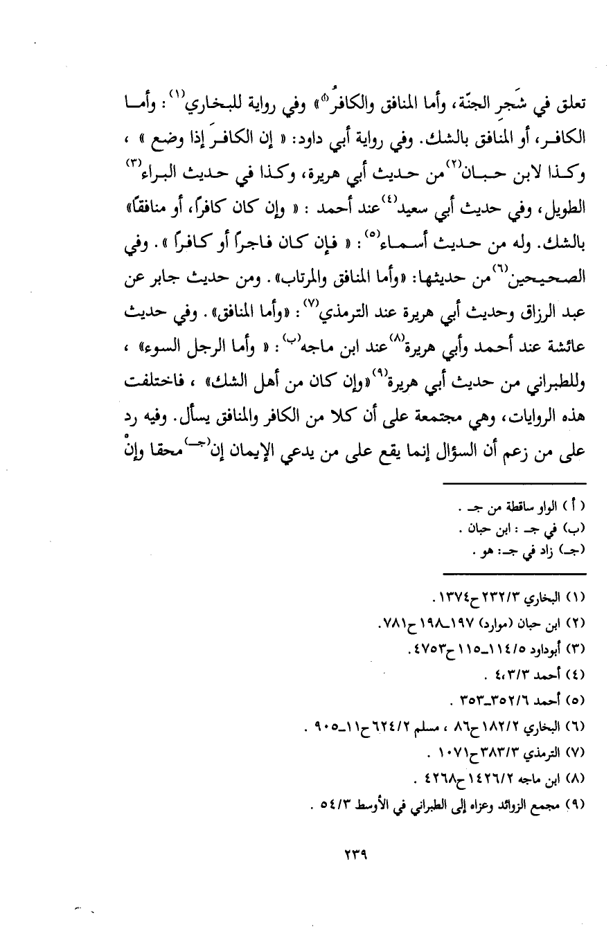 تعلق في شَجرِ الجنة، وأما المنافق والكافرُ (أ) " وفي رواية للبخاري (¬1): وأما الكافر، أو المنافق بالشك. وفي رواية أبي داود: "إن الكافرَ إذا وضع"، وكذا لابن حبان (¬2) من حديث أبي هريرة، وكذا في حديث البراء (¬3) الطويل، وفي حديث أبي سعيد (¬4) عند أحمد: "وإن كان كافرًا، أو منافقًا" بالشك. وله من حديث أسماء (¬5): "فإن كان فاجرًا أو كافرًا". وفي الصحيحين (¬6) من حديثها: "وأما المنافق والمرتاب". ومن حديث جابر عن عبد الرزاق وحديث أبي هريرة عند الترمذي (¬7): "وأما المنافق". وفي حديث عائشة عند أحمد وأبي هريرة (¬8) عند ابن ماجه (ب): "وأما الرجل السوء"، وللطبراني من حديث أبي هريرة (¬9) "وإن كان من أهل الشك"، فاختلفت هذه الروايات، وهي مجتمعة على أن كلا من الكافر والمنافق يسأل. وفيه رد على من زعم أن السؤال إنما يقع على من يدعى الإيمان إن (جـ) محقا وإنْ