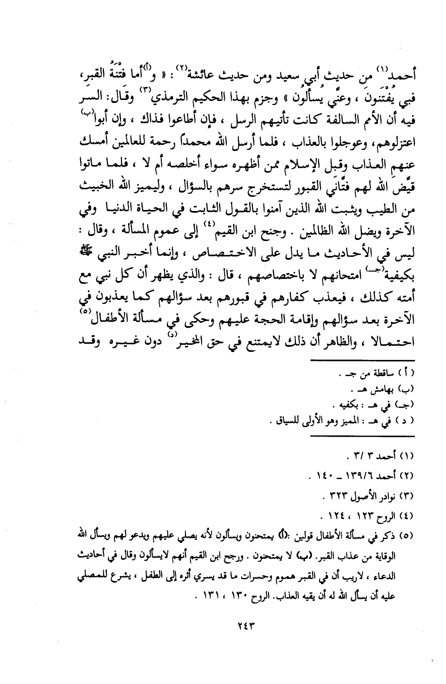 (¬5) ذكر في مسألة الأطفال قولين: (أ) يمتحنون ويسألون لأنه يصلي عليهم ويدعو لهم ويسأل الله الوقاية من عذاب القبر. (ب) لا يمتحنون. ورجع ابن القيم أنهم لا يسألون وقال في أحاديث الدعاء، لا ريب أن في القبر هموم وحسرات ما قد يسري أثره إلى الطفل، يشرع للمصلي عليه أن يسأل الله له أن يقيه العذاب. الروح 130، 131.