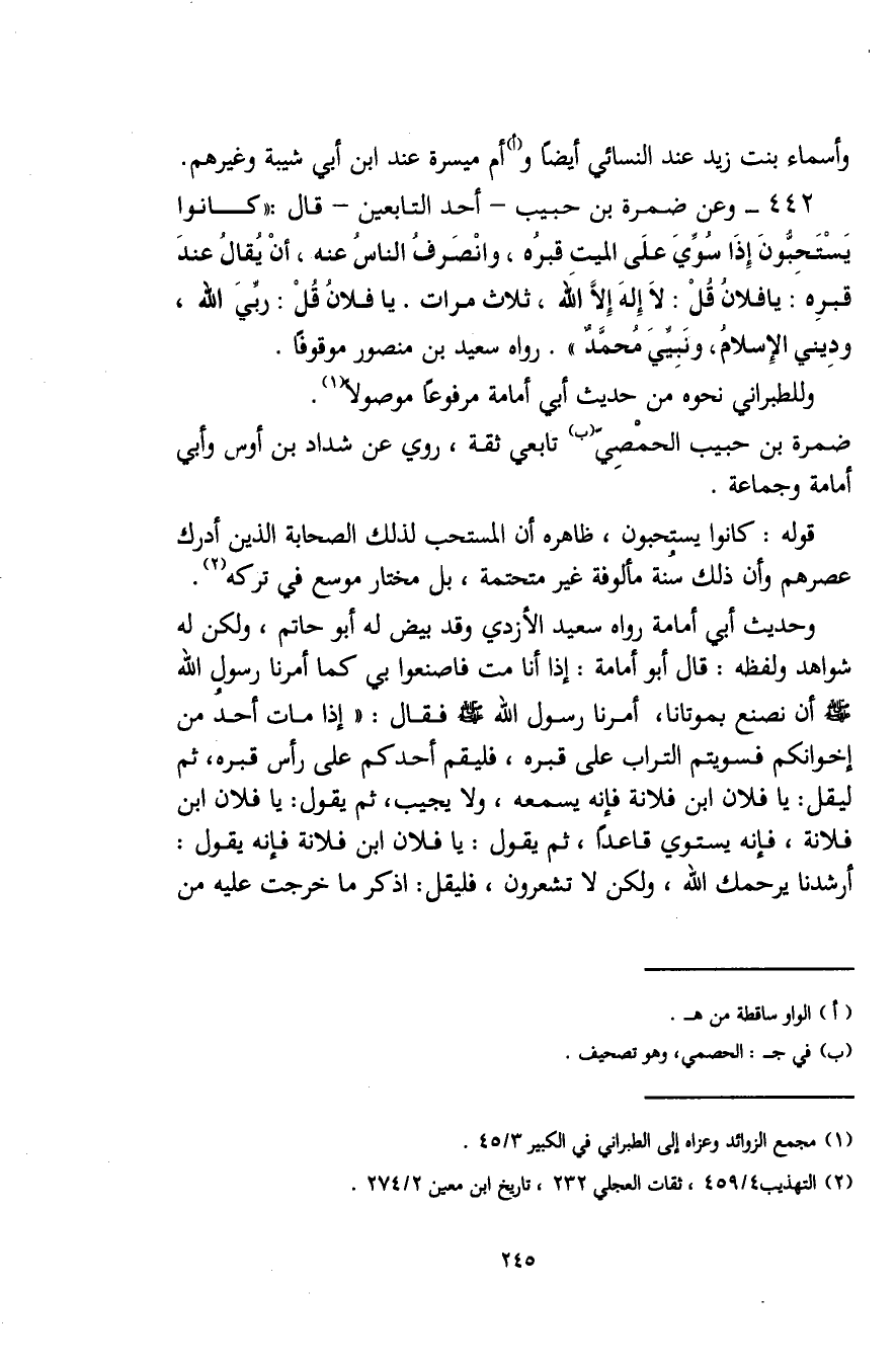 442 - وعن ضمرة بن حبيب -أحد التابعين- قال: "كانوا يَسْتَحِبّونَ إِذَا سُوِّيَ علَى الميت قبرُه، وانْصرف الناسُ عنه، أنْ يُقالُ عندَ قبرِه: يا فلان قلْ: لَا إِله إِلَّا الله، ثلاث مرات. يا فلانُ قُلْ: ربِّيَ الله، ودِيني الإِسلام، ونَبِيِّيَ مُحمَّدٌ". رواه سعيد بن منصور موقوفًا.