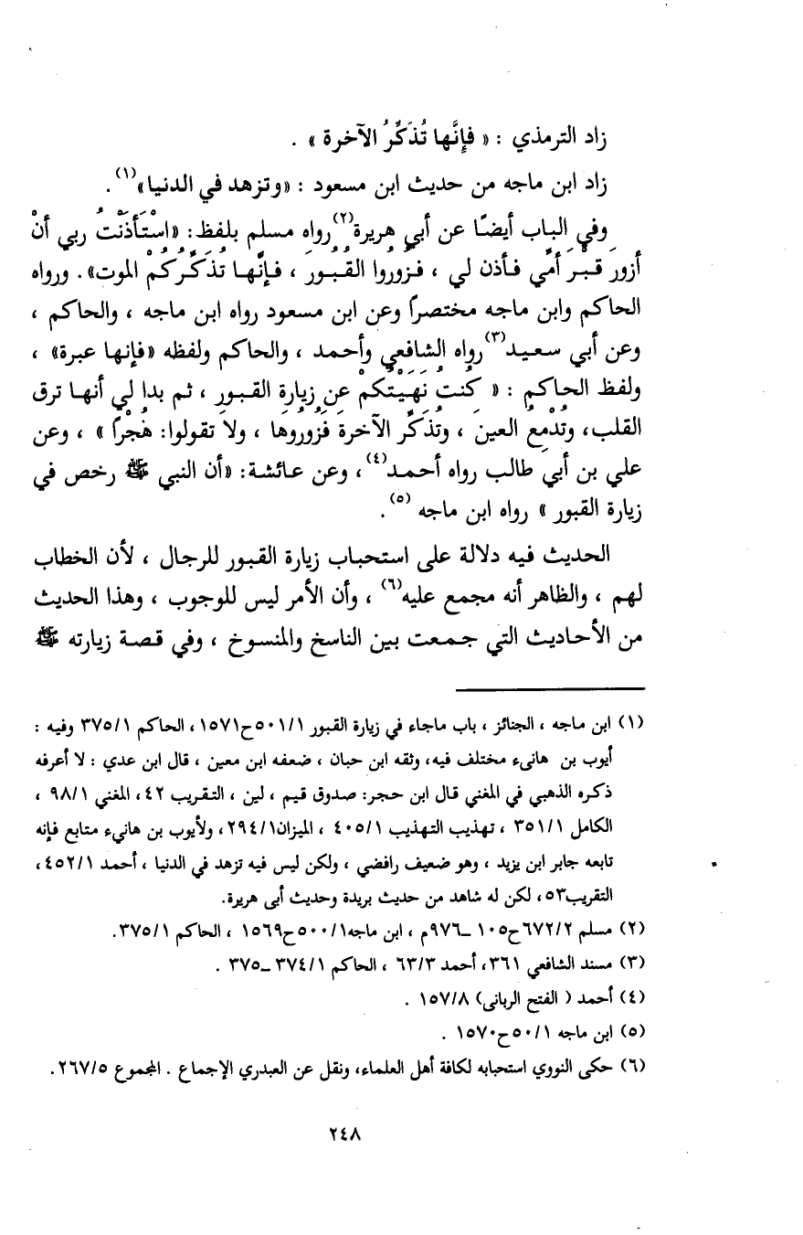 (¬1) ابن ماجه، الجنائز، باب ما جاء في زيارة القبور 1/ 501 ح 1571، الحاكم 1/ 375 وفيه: أيوب بن هانئ مختلف فيه، وثقه ابن حبان، ضعفه ابن معين، قال ابن عدي: لا أعرفه ذكره الذهبي في المغني قال ابن حجر: صدوق قيم، لين، التقريب 42، المغني 1/ 98، الكامل 1/ 351، تهذيب التهذبب 1/ 405، الميزان 1/ 294، ولأيوب بن هانئ متابع فإنه تابعه جابر بن يزيد، وهو ضعيف رافضي، ولكن ليس فيه تزهد في الدنيا، أحمد 1/ 452، التقريب 53، لكن له شاهد من حديث بريدة وحديث أبي هريرة.