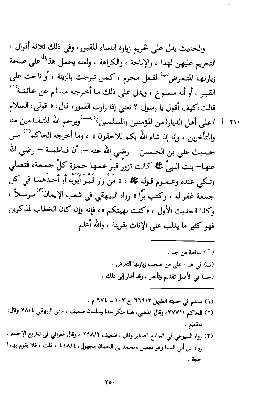 والحديث يدل على تحريم زيارة النساء للقبور، وفي ذلك ثلاثة أقوال: التحريم عليهن لهذا، والإباحة، والكراهة، ولعله يحمل هذا (أ) على صحة زيارتها المتعرض (ب) لفعل محرم، كمن تبرجت بالزينة، أو ناحت على القبر، أو أنه منسوخ، ويدل على ذلك ما أخرجه مسلم عن عائشة (¬1) قالت: كيف أقول يا رسول؟ تعني إذا زارت القبور، قال: "قولي: السلام على أهل الديار (من المؤمنين والمسلمين) (جـ) ويرحم الله المتقدمين منا والمتأخرين، وإنا إن شاء الله بكم للاحقون"، وما أخرجه الحاكم (¬2) من حديث علي بن الحسين - رضي الله عنه -: أن فاطمة - رضي الله عنها - بنت النبي - صلى الله عليه وسلم - كانت تزورُ قبرَ عمها حمزة كل جمعة، فتصلي وتبكي عنده وعموم قوله - صلى الله عليه وسلم -: "مَنْ زار قَبْرَ أبَويه أو أحدَهما في كل جمعة غفر له، وكتب برًّا" رواه البيهقي في شعب الإيمان (¬3) مرسلًا، وكذا الحديث الأول، "كنت نهيتكم"، فإنه كان كان الخطاب لمذكرين فهو كثير ما يغلب على الإناث بقرينة، والله أعلم.